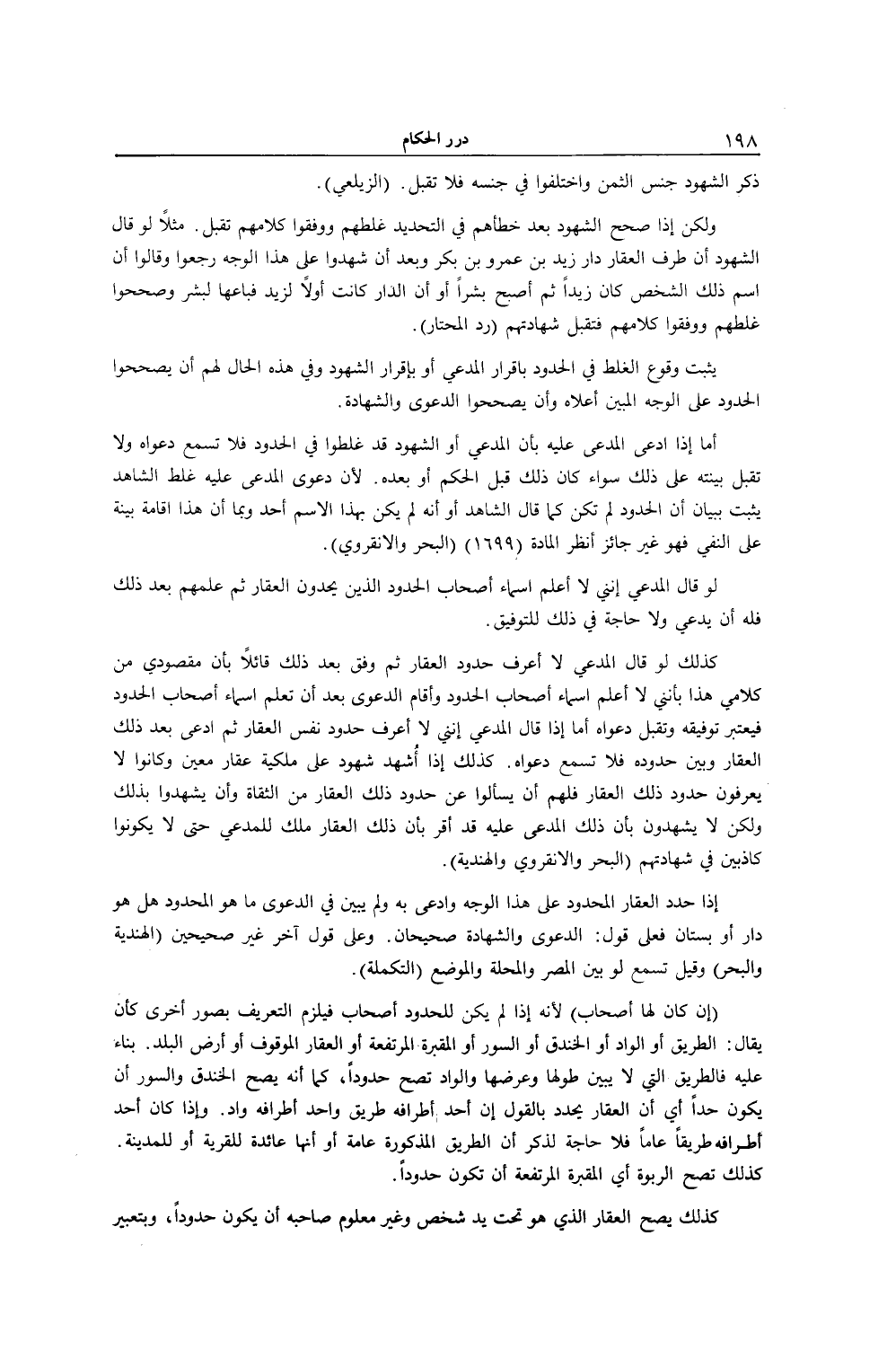 كَذَلِكَ لَوْ قَالَ الْمُدَّعِي: لَا أَعْرِفُ حُدُودَ الْعَقَارِ ثُمَّ وَفَّقَ بَعْدَ ذَلِكَ قَائِلًا بِأَنَّ مَقْصُودِي مِنْ كَلَامِي هَذَا بِأَنَّنِي لَا أَعْلَمُ أَسْمَاءَ أَصْحَابِ الْحُدُودِ وَأَقَامَ الدَّعْوَى بَعْدَ أَنْ تُعْلَمَ أَسْمَاءُ أَصْحَابِ الْحُدُودِ فَيُعْتَبَرُ تَوْفِيقُهُ وَتُقْبَلُ دَعْوَاهُ أَمَّا إذَا قَالَ الْمُدَّعِي: إنَّنِي لَا أَعْرِفُ حُدُودَ نَفْسِ الْعَقَارِ ثُمَّ ادَّعَى بَعْدَ ذَلِكَ الْعَقَارَ وَبَيَّنَ حُدُودَهُ فَلَا تُسْمَعُ دَعْوَاهُ.