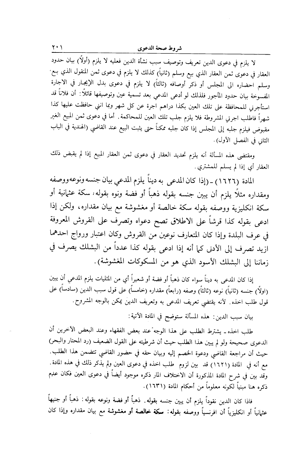 الْمَادَّةُ (1626) - (إذَا كَانَ الْمُدَّعَى بِهِ دَيْنًا يَلْزَمُ الْمُدَّعِيَ بَيَانُ جِنْسِهِ وَنَوْعِهِ وَوَصْفِهِ وَمِقْدَارِهِ مَثَلًا يَلْزَمُ أَنْ يُبَيِّنَ جِنْسَهُ بِقَوْلِهِ ذَهَبًا أَوْ فِضَّةً وَنَوْعَهُ بِقَوْلِهِ سِكَّةٌ عُثْمَانِيَّةٌ أَوْ سِكَّةٌ إنْكِلِيزِيَّةٌ وَوَصْفَهُ بِقَوْلِهِ سِكَّةٌ خَالِصَةٌ أَوْ مَغْشُوشَةٌ مَعَ بَيَانِ مِقْدَارِهِ، وَلَكِنْ إذَا ادَّعَى بِقَوْلِهِ كَذَا قِرْشًا عَلَى الْإِطْلَاقِ تَصِحُّ دَعْوَاهُ وَتُصْرَفُ عَلَى الْقُرُوشِ الْمَعْرُوفَةِ فِي عُرْفِ الْبَلْدَةِ وَإِذَا كَانَ الْمُتَعَارَفُ نَوْعَيْنِ مِنْ الْقُرُوشِ وَكَانَ اعْتِبَارُ وَرَوَاجُ أَحَدِهِمَا أَزْيَدَ تُصْرَفُ إلَى الْأَدْنَى كَمَا أَنَّهُ إذَا ادَّعَى بِقَوْلِهِ كَذَا عَدَدًا مِنْ البشلك يُصْرَفُ فِي زَمَانِنَا إلَى البشلك الْأَسْوَدِ الَّذِي هُوَ مِنْ الْمَسْكُوكَاتِ الْمَغْشُوشَةِ) . إذَا كَانَ الْمُدَّعَى بِهِ دَيْنًا سَوَاءٌ كَانَ ذَهَبًا أَوْ فِضَّةً أَوْ شَعِيرًا أَيْ مِنْ الْمِثْلِيَّاتِ يَلْزَمُ الْمُدَّعِيَ أَنْ يُبَيِّنَ (أَوَّلًا) جِنْسَهُ (ثَانِيًا) نَوْعَهُ (ثَالِثًا) وَصْفَهُ (رَابِعًا) مِقْدَارَهُ (خَامِسًا) عَلَى قَوْلٍ سَبَبَ الدَّيْنِ (سَادِسًا) عَلَى قَوْلٍ طَلَبَ أَخْذِهِ؛ لِأَنَّهُ يَقْتَضِي تَعْرِيفَ الْمُدَّعَى بِهِ وَتَعْرِيفُ الدَّيْنِ يُمْكِنُ بِالْوَجْهِ الْمَشْرُوحِ.