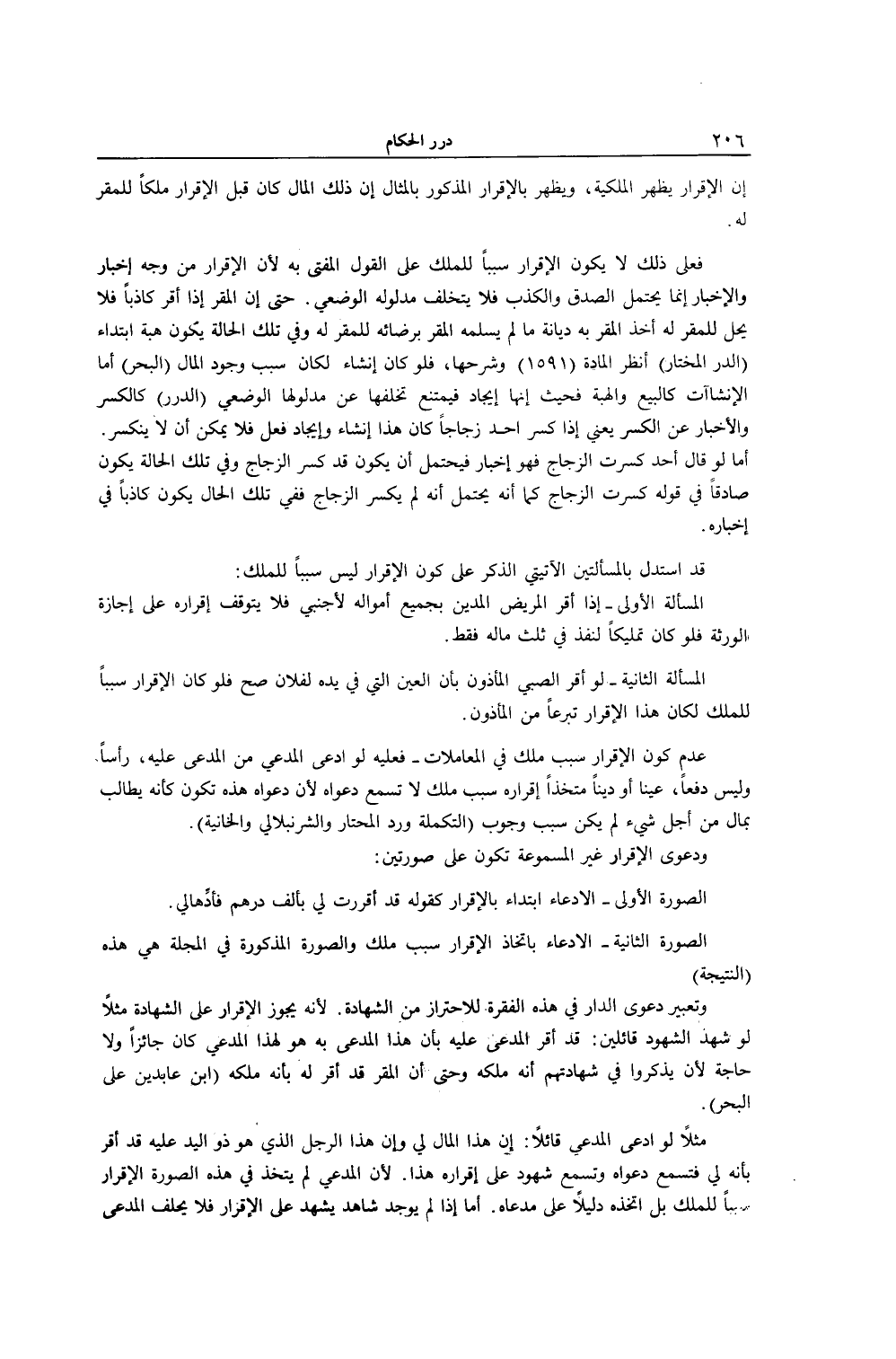 الصُّورَةُ الثَّانِيَةُ - الِادِّعَاءُ بِاِتِّخَاذِ الْإِقْرَارِ سَبَبَ مِلْكٍ وَالصُّورَةُ الْمَذْكُورَةُ فِي الْمَجَلَّةِ هِيَ هَذِهِ (النَّتِيجَةُ) وَتَعْبِيرُ دَعْوَى الدَّارِ فِي هَذِهِ الْفِقْرَةِ لِلِاحْتِرَازِ مِنْ الشَّهَادَةِ لِأَنَّهُ يَجُوزُ الْإِقْرَارُ عَلَى الشَّهَادَةِ مَثَلًا لَوْ شَهِدَ الشُّهُودُ قَائِلِينَ: قَدْ أَقَرَّ الْمُدَّعَى عَلَيْهِ بِأَنَّ هَذَا الْمُدَّعَى بِهِ هُوَ لِهَذَا الْمُدَّعِي كَانَ جَائِزًا وَلَا حَاجَةَ لَأَنْ يَذْكُرُوا فِي شَهَادَتِهِمْ إنَّكَ مِلْكُهُ وَحَتَّى الدَّعْوَى الْمُقِرَّ قَدْ أَقَرَّ لَهُ بِأَنَّهُ مِلْكُهُ (ابْنُ عَابِدِينَ عَلَى الْبَحْرِ) .