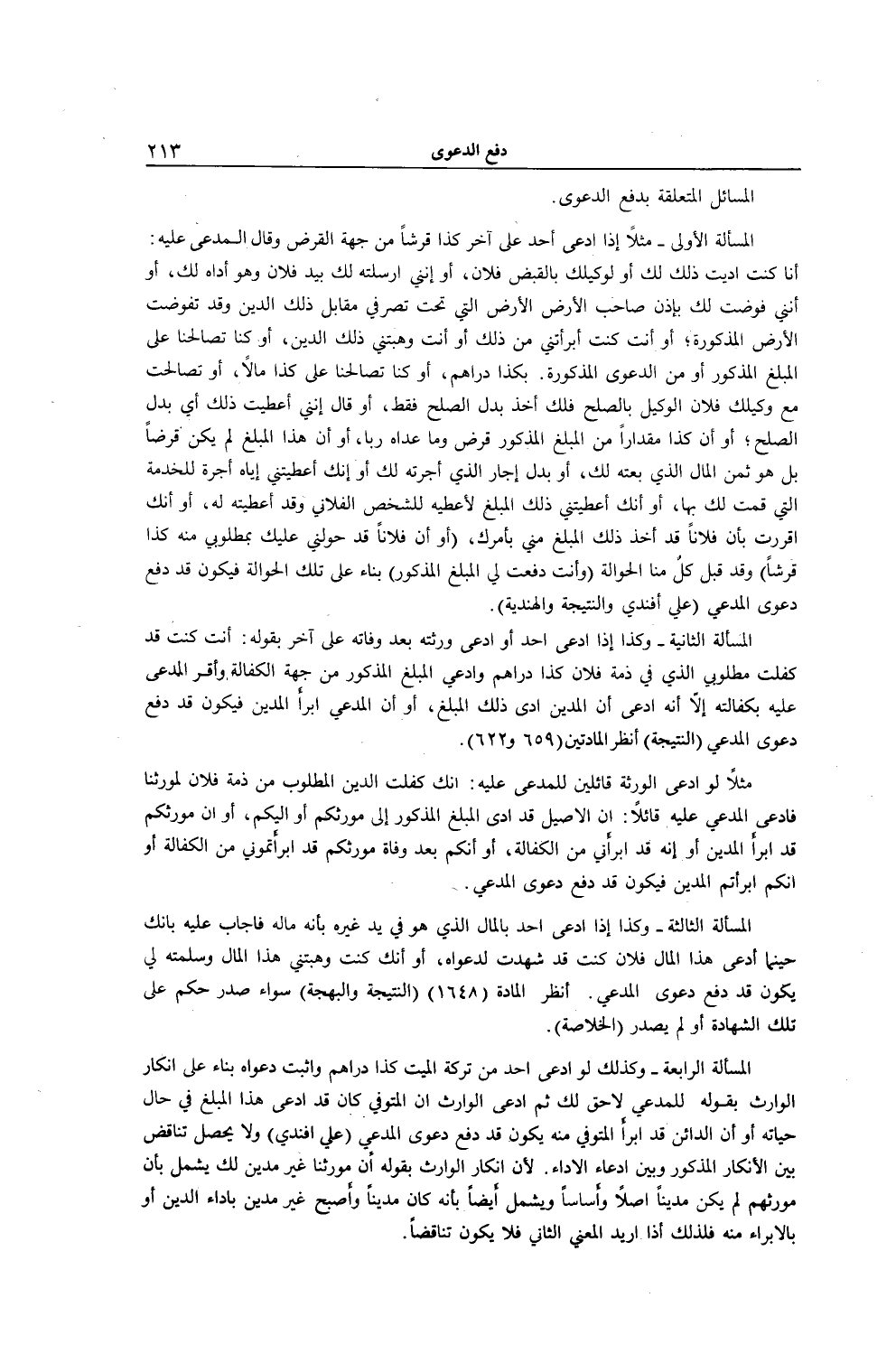 الْمَسْأَلَةُ الْأُولَى - مَثَلًا إذَا ادَّعَى أَحَدٌ عَلَى آخَرَ كَذَا قِرْشًا مِنْ جِهَةِ الْقَرْضِ وَقَالَ الْمُدَّعَى عَلَيْهِ: أَنَا كُنْت أَدَّيْت ذَلِكَ لَك أَوْ لِوَكِيلِك بِالْقَبْضِ فُلَانٍ، أَوْ إنَّنِي أَرْسَلْته لَك بِيَدِ فُلَانٍ وَهُوَ أَدَّاهُ لَك، أَوْ إنَّنِي فَوَّضْت لَك بِإِذْنِ صَاحِبِ الْأَرْضِ الْأَرْضَ الَّتِي تَحْتَ تَصَرُّفِي مُقَابِلَ ذَلِكَ الدَّيْنِ وَقَدْ تَفَوَّضَتْ الْأَرْضُ الْمَذْكُورَةُ؛ أَوْ أَنْتَ كُنْت أَبْرَأْتنِي مِنْ ذَلِكَ أَوْ أَنْتَ وَهَبْتنِي ذَلِكَ الدَّيْنَ، أَوْ كُنَّا تَصَالَحْنَا عَلَى الْمَبْلَغِ الْمَذْكُورِ أَوْ مِنْ الدَّعْوَى الْمَذْكُورَةِ، بِكَذَا دَرَاهِمَ، أَوْ كُنَّا تَصَالَحْنَا عَلَى كَذَا مَالًا، أَوْ تَصَالَحْت مَعَ وَكِيلِك فُلَانٍ الْوَكِيلِ بِالصُّلْحِ فَلَكَ أَخْذُ بَدَلِ الصُّلْحِ فَقَطْ، أَوْ قَالَ إنَّنِي أَعْطَيْت ذَلِكَ أَيْ بَدَلَ الصُّلْحِ؛ أَوْ أَنَّ كَذَا مِقْدَارًا مِنْ الْمَبْلَغِ الْمَذْكُورِ قَرْضٌ وَمَا عَدَاهُ رِبًا، أَوْ أَنَّ هَذَا الْمَبْلَغَ لَمْ يَكُنْ قَرْضًا بَلْ هُوَ ثَمَنُ الْمَالِ الَّذِي بِعْته لَك، أَوْ بَدَلُ إجَارِ الَّذِي أَجَرْته لَك أَوْ إنَّك أَعْطَيْتنِي إيَّاهُ أُجْرَةً لِلْخِدْمَةِ الَّتِي قُمْت لَك بِهَا، أَوْ أَنَّك أَعْطَيْتنِي ذَلِكَ الْمَبْلَغَ لِأُعْطِيَهُ لِلشَّخْصِ الْفُلَانِيِّ وَقَدْ أَعْطَيْته لَهُ، أَوْ أَنَّك أَقْرَرْت بِأَنَّ فُلَانًا قَدْ أَخَذَ ذَلِكَ الْمَبْلَغَ مِنِّي بِأَمْرِك، (أَوْ أَنَّ فُلَانًا قَدْ حَوَّلَنِي عَلَيْك بِمَطْلُوبِي مِنْهُ كَذَا قِرْشًا) وَقَدْ قَبِلَ كُلٌّ مِنَّا الْحَوَالَةَ (وَأَنْتَ دَفَعْت لِي الْمَبْلَغَ الْمَذْكُورَ) بِنَاءً عَلَى تِلْكَ الْحَوَالَةِ فَيَكُونُ قَدْ دَفَعَ دَعْوَى الْمُدَّعِي (عَلِيٌّ أَفَنْدِي وَالنَّتِيجَةُ وَالْهِنْدِيَّةُ) .