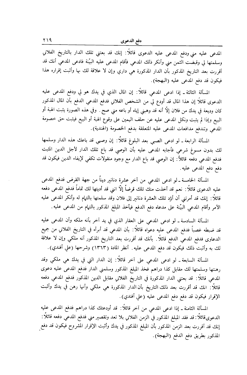 الْمُدَّعَى عَلَيْهِ مِنِّي وَدَفَعَ الْمُدَّعَى عَلَيْهِ الدَّعْوَى قَائِلًا: إنَّك قَدْ بِعْتنِي تِلْكَ الدَّارَ بِالتَّارِيخِ الْفُلَانِيِّ وَسَلَّمْتهَا لِي وَقَبَضْتَ الثَّمَنَ مِنِّي وَأَنْكَرَ ذَلِكَ الْمُدَّعِي فَأَقَامَ الْمُدَّعَى عَلَيْهِ الْبَيِّنَةَ فَادَّعَى الْمُدَّعِي أَنَّك قَدْ أَقْرَرْت بَعْدَ التَّارِيخِ الْمَذْكُورِ بِأَنَّ الدَّارَ الْمَذْكُورَةَ هِيَ دَارِي وَأَنْ لَا عَلَاقَةَ لَك بِهَا وَأَثْبَتَ إقْرَارَهُ هَذَا فَيَكُونُ قَدْ دَفَعَ الْمُدَّعَى عَلَيْهِ (الْبَهْجَةُ) .