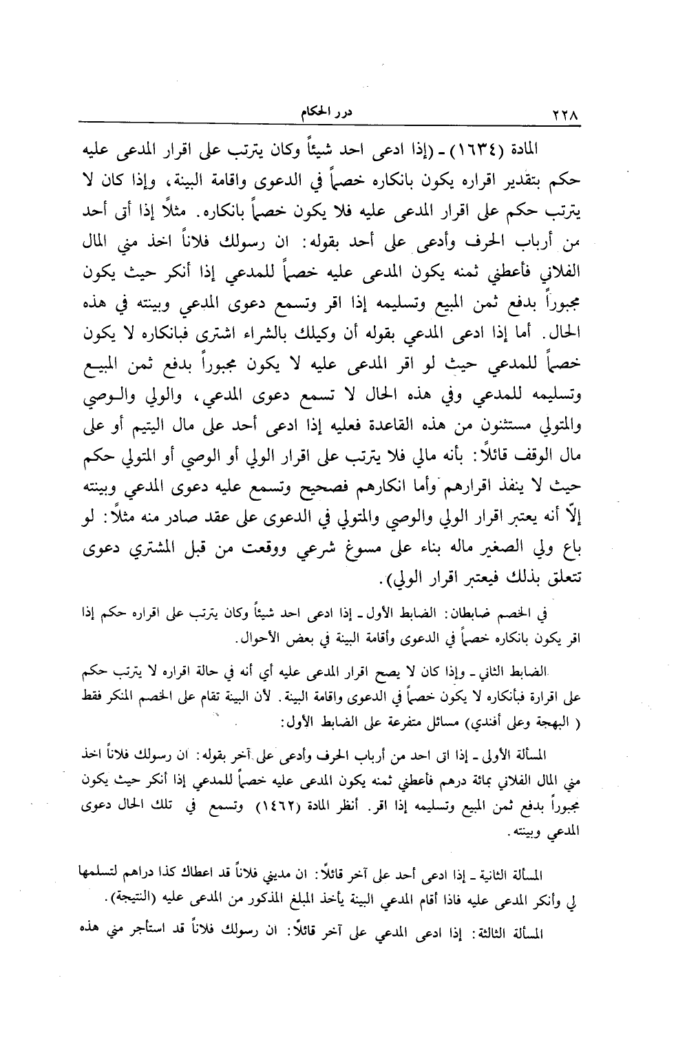 الْمَادَّةُ (1634) - (إذَا ادَّعَى أَحَدٌ شَيْئًا وَكَانَ يَتَرَتَّبُ عَلَى إقْرَارِ الْمُدَّعَى عَلَيْهِ حُكْمٌ بِتَقْدِيرِ إقْرَارِهِ يَكُونُ بِإِنْكَارِهِ خَصْمًا فِي الدَّعْوَى وَإِقَامَةِ الْبَيِّنَةِ، وَإِذَا كَانَ لَا يَتَرَتَّبُ حُكْمٌ عَلَى إقْرَارِ الْمُدَّعَى عَلَيْهِ فَلَا يَكُونُ خَصْمًا بِإِنْكَارِهِ. مَثَلًا إذَا كَانَ أَحَدٌ مِنْ أَرْبَابِ الْحِرَفِ وَادَّعَى عَلَى أَحَدٍ بِقَوْلِهِ: إنَّ رَسُولَك فُلَانًا أَخَذَ مِنِّي الْمَالَ الْفُلَانِيَّ فَأَعْطِنِي ثَمَنَهُ يَكُونُ الْمُدَّعَى عَلَيْهِ خَصْمًا لِلْمُدَّعِي إذَا أَنْكَرَ حَيْثُ يَكُونُ مَجْبُورًا بِدَفْعِ ثَمَنِ الْمَبِيعِ وَتَسْلِيمِهِ إذَا أَقَرَّ وَتُسْمَعُ دَعْوَى الْمُدَّعِي وَبَيِّنَتُهُ فِي هَذِهِ الْحَالِ. أَمَّا إذَا ادَّعَى الْمُدَّعِي بِقَوْلِهِ إنَّ وَكِيلَك بِالشِّرَاءِ اشْتَرَى فَبِإِنْكَارِهِ لَا يَكُونُ خَصْمًا لِلْمُدَّعِي حَيْثُ لَوْ أَقَرَّ الْمُدَّعَى عَلَيْهِ لَا يَكُونُ مَجْبُورًا بِدَفْعِ ثَمَنِ الْمَبِيعِ وَتَسْلِيمِهِ لِلْمُدَّعِي وَفِي هَذِهِ الْحَالِ لَا تُسْمَعُ دَعْوَى الْمُدَّعِي، وَالْوَلِيُّ وَالْوَصِيُّ وَالْمُتَوَلِّي مُسْتَثْنَوْنَ مِنْ هَذِهِ الْقَاعِدَةِ فَعَلَيْهِ إذَا ادَّعَى أَحَدٌ عَلَى مَالِ الْيَتِيمِ أَوْ عَلَى مَالِ الْوَقْفِ قَائِلًا: بِأَنَّهُ مَالِي فَلَا يَتَرَتَّبُ عَلَى إقْرَارِ الْوَلِيِّ أَوْ الْوَصِيِّ أَوْ الْمُتَوَلِّي حُكْمٌ حَيْثُ لَا يَنْفُذُ إقْرَارُهُمْ وَأَمَّا إنْكَارُهُمْ فَصَحِيحٌ وَتُسْمَعُ عَلَيْهِ دَعْوَى الْمُدَّعِي وَبَيِّنَتُهُ إلَّا أَنَّهُ يُعْتَبَرُ إقْرَارُ الْوَلِيِّ وَالْوَصِيِّ وَالْمُتَوَلِّي فِي الدَّعْوَى عَلَى عَقْدٍ صَادِرٍ مِنْهُ مَثَلًا: لَوْ بَاعَ وَلِيُّ الصَّغِيرِ مَالَهُ بِنَاءً عَلَى مُسَوِّغٍ شَرْعِيٍّ وَوَقَعَتْ مِنْ قِبَلِ الْمُشْتَرِي دَعْوَى تَتَعَلَّقُ بِذَلِكَ فَيُعْتَبَرُ إقْرَارُ الْوَلِيِّ) . فِي الْخَصْمِ ضَابِطَانِ: الضَّابِطُ الْأَوَّلُ - إذَا ادَّعَى أَحَدٌ شَيْئًا وَكَانَ يَتَرَتَّبُ عَلَى إقْرَارِهِ حُكْمٌ إذَا أَقَرَّ يَكُونُ بِإِنْكَارِهِ خَصْمًا فِي الدَّعْوَى وَإِقَامَةِ الْبَيِّنَةِ فِي بَعْضِ الْأَحْوَالِ.