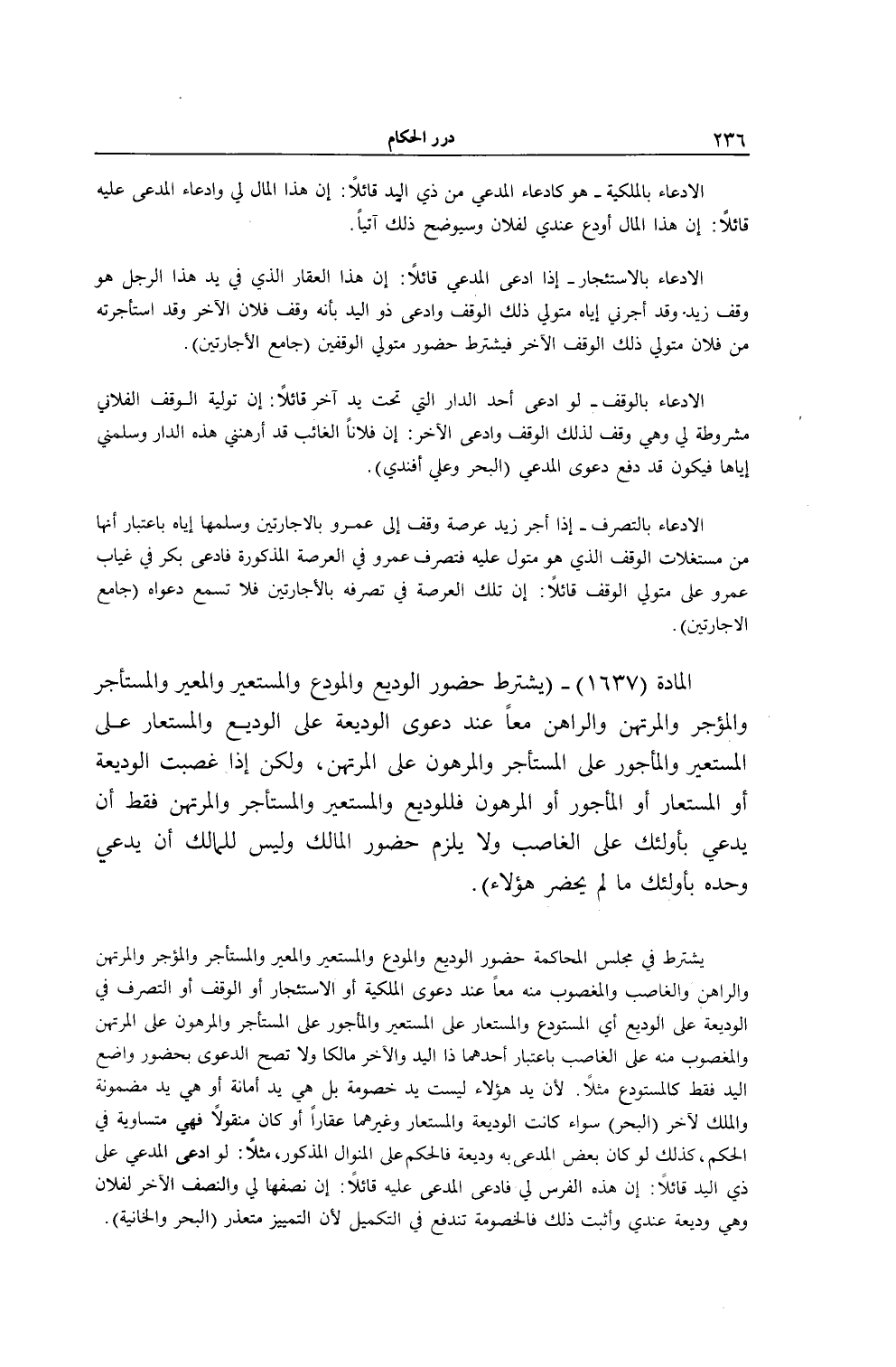 الْمَادَّةُ (1637) - (يُشْتَرَطُ حُضُورُ الْوَدِيعِ وَالْمُودِعِ وَالْمُسْتَعِيرِ وَالْمُعِيرِ وَالْمُسْتَأْجِرِ وَالْمُؤَجِّرِ وَالْمُرْتَهِنِ وَالرَّاهِنِ مَعًا عِنْدَ دَعْوَى الْوَدِيعَةِ عَلَى الْوَدِيعِ وَالْمُسْتَعَارِ عَلَى الْمُسْتَعِيرِ وَالْمَأْجُورِ عَلَى الْمُسْتَأْجِرِ وَالْمَرْهُونِ عَلَى الْمُرْتَهِنِ، وَلَكِنْ إذَا غُصِبَتْ الْوَدِيعَةُ أَوْ الْمُسْتَعَارُ أَوْ الْمَأْجُورُ أَوْ الْمَرْهُونُ فَلِلْوَدِيعِ وَالْمُسْتَعِيرِ وَالْمُسْتَأْجِرِ وَالْمُرْتَهِنِ فَقَطْ أَنْ يَدَّعِيَ بِأُولَئِكَ عَلَى الْغَاصِبِ وَلَا يَلْزَمُ حُضُورُ الْمَالِكِ وَلَيْسَ لِلْمَالِكِ أَنْ يَدَّعِيَ وَحْدَهُ بِأُولَئِكَ مَا لَمْ يَحْضُرْ هَؤُلَاءِ) . يُشْتَرَطُ فِي مَجْلِسِ الْمُحَاكَمَةِ حُضُورُ الْوَدِيعِ وَالْمُودِعِ وَالْمُسْتَعِيرِ وَالْمُعِيرِ وَالْمُسْتَأْجِرِ وَالْمُؤَجِّرِ وَالْمُرْتَهِنِ وَالرَّاهِنِ وَالْغَاصِبِ وَالْمَغْصُوبِ مِنْهُ مَعًا عِنْدَ دَعْوَى الْمِلْكِيَّةِ أَوْ الِاسْتِئْجَارِ أَوْ الْوَقْفِ أَوْ التَّصَرُّفِ فِي الْوَدِيعَةِ عَلَى الْوَدِيعِ أَيْ الْمُسْتَوْدَعِ وَالْمُسْتَعَارِ عَلَى الْمُسْتَعِيرِ وَالْمَأْجُورِ عَلَى الْمُسْتَأْجِرِ وَالْمَرْهُونِ عَلَى الْمُرْتَهِنِ وَالْمَغْصُوبِ مِنْهُ عَلَى الْغَاصِبِ بِاعْتِبَارِ أَحَدِهِمَا ذَا الْيَدِ وَالْآخَرِ مَالِكًا وَلَا تَصِحُّ الدَّعْوَى بِحُضُورِ وَاضِعِ الْيَدِ فَقَطْ كَالْمُسْتَوْدِعِ مَثَلًا؛ لِأَنَّ يَدَ هَؤُلَاءِ لَيْسَتْ يَدَ خُصُومَةٍ بَلْ هِيَ يَدُ أَمَانَةٍ أَوْ هِيَ يَدٌ مَضْمُونَةٌ وَالْمِلْكُ لِآخَرَ (الْبَحْرُ) سَوَاءٌ كَانَتْ الْوَدِيعَةُ وَالْمُسْتَعَارُ وَغَيْرُهُمَا عَقَارًا أَوْ كَانَ مَنْقُولًا فَهِيَ مُتَسَاوِيَةٌ فِي الْحُكْمِ، كَذَلِكَ لَوْ كَانَ بَعْضُ الْمُدَّعَى بِهِ وَدِيعَةً فَالْحُكْمُ عَلَى الْمِنْوَالِ الْمَذْكُورِ، مَثَلًا: لَوْ ادَّعَى الْمُدَّعِي عَلَى ذِي الْيَدِ قَائِلًا: إنَّ هَذِهِ الْفَرَسَ لِي فَادَّعَى الْمُدَّعَى عَلَيْهِ قَائِلًا: إنَّ نِصْفَهَا لِي وَالنِّصْفُ الْآخَرُ لِفُلَانٍ وَهِيَ وَدِيعَةٌ عِنْدِي وَأَثْبَتَ ذَلِكَ فَالْخُصُومَةُ تَنْدَفِعُ فِي التَّكْمِيلِ لِأَنَّ التَّمْيِيزَ مُتَعَذَّرٌ (الْبَحْرُ وَالْخَانِيَّةُ) .