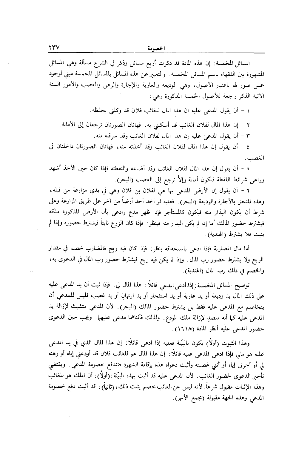 الْمَسَائِلُ الْمُخَمَّسَةُ: إنَّ هَذِهِ الْمَادَّةَ قَدْ ذَكَرَتْ أَرْبَعَ مَسَائِلَ وَذَكَرَ فِي الشَّرْحِ مَسْأَلَةً وَهِيَ الْمَسَائِلُ الْمَشْهُورَةُ بَيْنَ الْفُقَهَاءِ بِاسْمِ الْمَسَائِلِ الْمُخَمَّسَةِ. وَالتَّعْبِيرُ عَنْ هَذِهِ الْمَسَائِلِ بِالْمَسَائِلِ الْمُخَمَّسَةِ مَبْنِيٌّ لِوُجُودِ خَمْسِ صُوَرٍ لَهَا بِاعْتِبَارِ الْأُصُولِ، وَهِيَ الْوَدِيعَةُ وَالْعَارِيَّةُ وَالْإِجَارَةُ وَالرَّهْنُ وَالْغَصْبُ وَالْأُمُورُ السِّتَّةُ الْآتِيَةُ الذِّكْرِ رَاجِعَةٌ لِلْأُصُولِ الْخَمْسَةِ الْمَذْكُورَةِ وَهِيَ: