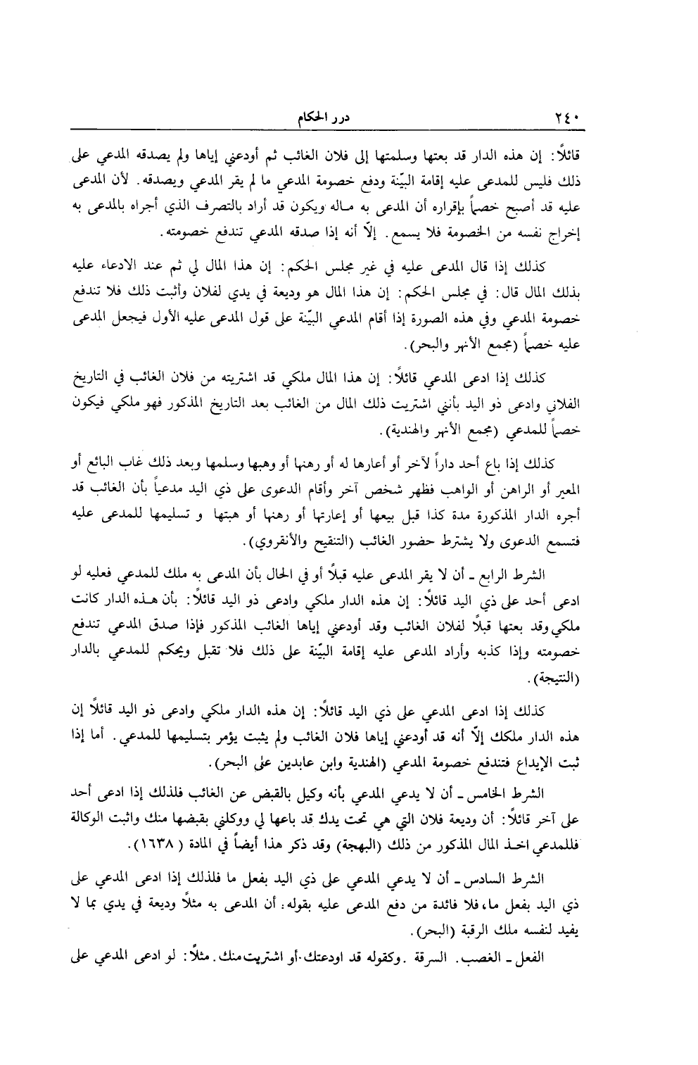 الشَّرْطُ السَّادِسُ - أَنْ لَا يَدَّعِيَ الْمُدَّعِي عَلَى ذِي الْيَدِ بِفِعْلٍ مَا فَلِذَلِكَ إذَا ادَّعَى الْمُدَّعِي عَلَى ذِي الْيَدِ بِفِعْلٍ مَا، فَلَا فَائِدَةَ مِنْ دَفْعِ الْمُدَّعَى عَلَيْهِ بِقَوْلِهِ: إنَّ الْمُدَّعَى بِهِ مَثَلًا وَدِيعَةٌ فِي يَدِي بِمَا لَا يُفِيدُ لِنَفْسِهِ مِلْكَ الرَّقَبَةِ (الْبَحْرُ) . الْفِعْلُ - الْغَصْبُ. السَّرِقَةُ. وَكَقَوْلِهِ قَدْ أَوْدَعْتُك. أَوْ اشْتَرَيْت مِنْك. مَثَلًا: لَوْ ادَّعَى الْمُدَّعِي عَلَى