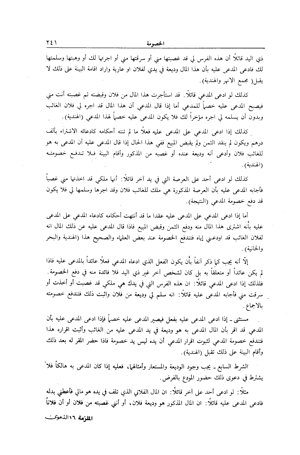 الشَّرْطُ السَّابِعُ - يَجِبُ وُجُودُ الْوَدِيعَةِ وَالْمُسْتَعَارِ وَأَمْثَالِهِمَا، فَعَلَيْهِ إذَا كَانَ الْمُدَّعَى بِهِ هَالِكًا فَلَا يُشْتَرَطُ فِي دَعْوَى ذَلِكَ حُضُورُ الْمُودِعِ بِالْفَرْضِ. مَثَلًا: لَوْ ادَّعَى أَحَدٌ عَلَى آخَرَ قَائِلًا: إنَّ الْمَالَ الْفُلَانِيَّ الَّذِي تَلِفَ فِي يَدِهِ هُوَ مَالِي فَأَعْطِنِي بَدَلَهُ فَادَّعَى الْمُدَّعَى عَلَيْهِ قَائِلًا: إنَّ الْمَالَ الْمَذْكُورَ هُوَ وَدِيعَةُ فُلَانٍ، أَوْ إنَّنِي غَصَبْته مِنْ فُلَانٍ أَوْ أَنَّ فُلَانًا
