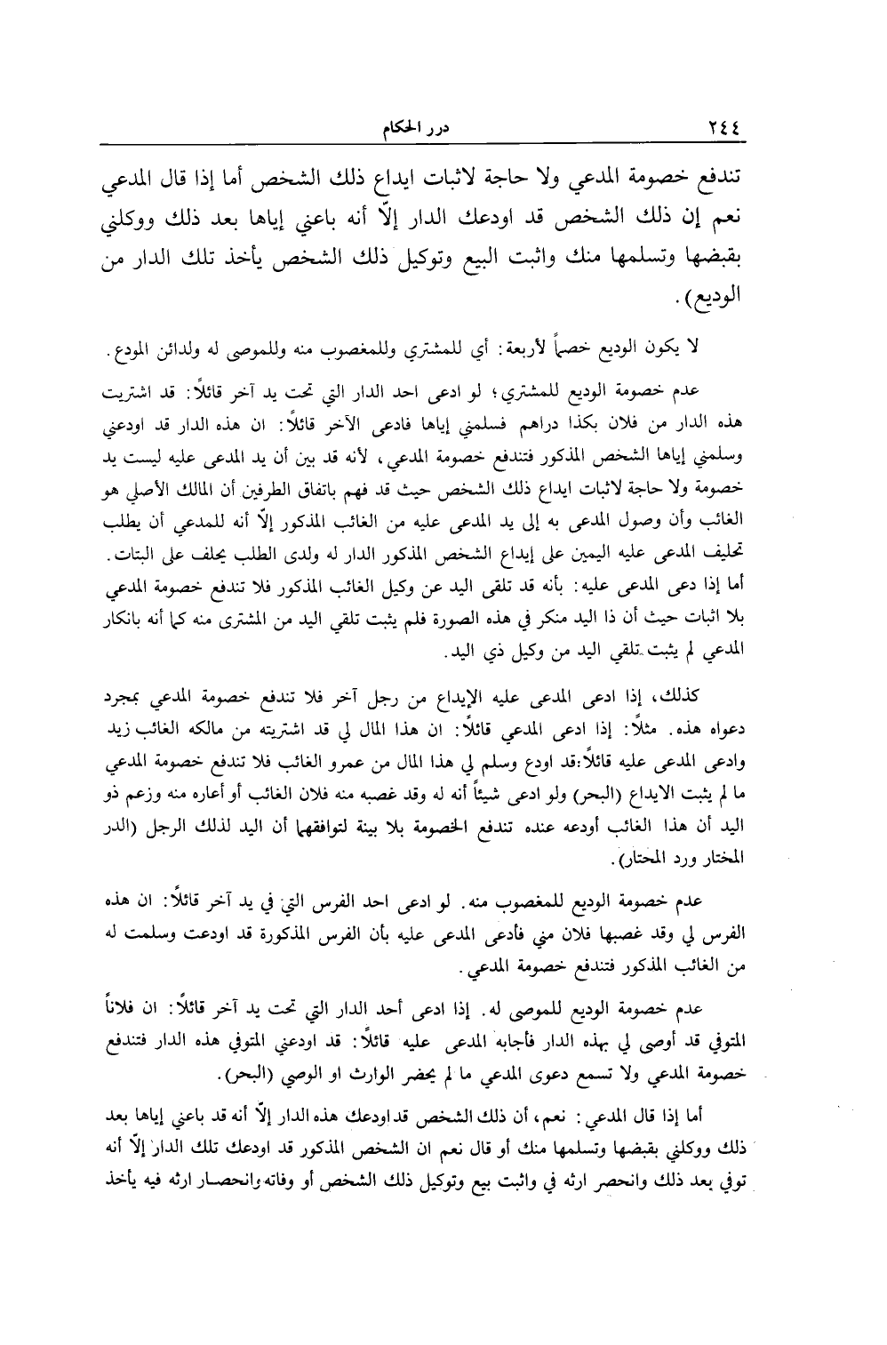 تَنْدَفِعُ خُصُومَةُ الْمُدَّعِي وَلَا حَاجَةَ لِإِثْبَاتِ إيدَاعِ ذَلِكَ الشَّخْصِ أَمَّا إذَا قَالَ الْمُدَّعِي نَعَمْ إنَّ ذَلِكَ الشَّخْصَ قَدْ أَوْدَعَك الدَّارَ إلَّا أَنَّهُ بَاعَنِي إيَّاهَا بَعْدَ ذَلِكَ وَوَكَّلَنِي بِقَبْضِهَا وَتَسَلَّمْهَا مِنْك وَأَثْبَتَ الْبَيْعَ وَتَوْكِيلَ ذَلِكَ الشَّخْصِ يَأْخُذُ تِلْكَ الدَّارَ مِنْ الْوَدِيعِ) . لَا يَكُونُ الْوَدِيعُ خَصْمًا لِأَرْبَعَةٍ: أَيْ لِلْمُشْتَرِي وَلِلْمَغْصُوبِ مِنْهُ وَلِلْمُوصَى لَهُ وَلِدَائِنِ الْمُودِعِ عَدَمُ خُصُومَةِ الْوَدِيعِ لِلْمُشْتَرِي؛ لَوْ ادَّعَى أَحَدٌ الدَّارَ الَّتِي تَحْتَ يَدِ آخَرَ قَائِلًا: قَدْ اشْتَرَيْت هَذِهِ الدَّارَ مِنْ فُلَانٍ بِكَذَا دَرَاهِمَ فَسَلَّمَنِي إيَّاهَا فَادَّعَى الْآخَرُ قَائِلًا: إنَّ هَذِهِ الدَّارَ قَدْ أَوْدَعَنِي وَسَلَّمَنِي إيَّاهَا الشَّخْصُ الْمَذْكُورُ فَتَنْدَفِعُ خُصُومَةُ الْمُدَّعِي، لِأَنَّهُ قَدْ بَيَّنَ أَنَّ يَدَ الْمُدَّعَى عَلَيْهِ لَيْسَتْ يَدَ خُصُومَةٍ وَلَا حَاجَةَ لِإِثْبَاتِ إيدَاعِ ذَلِكَ الشَّخْصِ حَيْثُ قَدْ فُهِمَ بِاتِّفَاقِ الطَّرَفَيْنِ أَنَّ الْمَالِكَ الْأَصْلِيَّ هُوَ الْغَائِبُ وَأَنَّ وُصُولَ الْمُدَّعَى بِهِ إلَى يَدِ الْمُدَّعَى عَلَيْهِ مِنْ الْغَائِبِ الْمَذْكُورِ إلَّا أَنَّهُ لِلْمُدَّعِي أَنْ يَطْلُبَ تَحْلِيفَ الْمُدَّعَى عَلَيْهِ الْيَمِينَ عَلَى إيدَاعِ الشَّخْصِ الْمَذْكُورِ الدَّارَ لَهُ وَلَدَى الطَّلَبِ يَحْلِفُ عَلَى الْبَتَاتِ. أَمَّا إذَا ادَّعَى الْمُدَّعَى عَلَيْهِ: بِأَنَّهُ قَدْ تَلَقَّى الْيَدَ عَنْ وَكِيلِ الْغَائِبِ الْمَذْكُورِ فَلَا تَنْدَفِعُ خُصُومَةُ الْمُدَّعِي بِلَا إثْبَاتٍ حَيْثُ إنَّ ذَا الْيَدِ مُنْكِرٌ فِي هَذِهِ الصُّورَةِ فَلَمْ يَثْبُتْ تَلَقِّي الْيَدِ مِنْ الْمُشْتَرِي مِنْهُ كَمَا أَنَّهُ بِإِنْكَارِ الْمُدَّعِي لَمْ يَثْبُتْ تَلَقِّي الْيَدِ مِنْ وَكِيلِ ذِي الْيَدِ. كَذَلِكَ، إذَا ادَّعَى الْمُدَّعَى عَلَيْهِ الْإِيدَاعَ مِنْ رَجُلٍ آخَرَ فَلَا تَنْدَفِعُ خُصُومَةُ الْمُدَّعِي بِمُجَرَّدِ دَعْوَاهُ هَذِهِ.