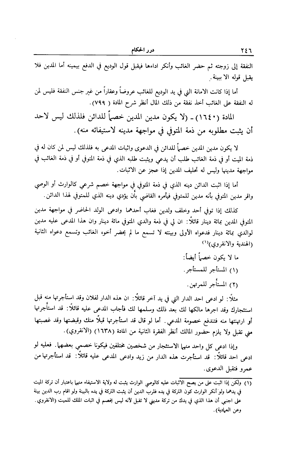 الْمَادَّةُ (1640) - (لَا يَكُونُ مَدِينُ الْمَدِينِ خَصْمًا لِلدَّائِنِ فَلِذَلِكَ لَيْسَ لِأَحَدٍ أَنْ يُثْبِتَ مَطْلُوبَهُ مِنْ ذِمَّةِ الْمُتَوَفَّى فِي مُوَاجَهَةِ مَدِينِهِ لِاسْتِيفَائِهِ مِنْهُ) . لَا يَكُونُ مَدِينُ الْمَدِينِ خَصْمًا لِلدَّائِنِ فِي الدَّعْوَى وَإِثْبَاتِ الْمُدَّعَى بِهِ فَلِذَلِكَ لَيْسَ لِمَنْ كَانَ لَهُ فِي ذِمَّةِ الْمَيِّتِ أَوْ فِي ذِمَّةِ الْغَائِبِ طَلَبٌ أَنْ يَدَّعِيَ وَيُثْبِتَ طَلَبَهُ الَّذِي فِي ذِمَّةِ الْمُتَوَفَّى أَوْ فِي ذِمَّةِ الْغَائِبِ فِي مُوَاجَهَةِ مَدِينِهَا وَلَيْسَ لَهُ تَحْلِيفُ الْمَدِينِ إذَا عَجَزَ عَنْ الْإِثْبَاتِ. أَمَّا إذَا أَثْبَتَ الدَّائِنُ دَيْنَهُ الَّذِي فِي ذِمَّةِ الْمُتَوَفَّى فِي مُوَاجَهَةِ خَصْمٍ شَرْعِيٍّ كَالْوَارِثِ أَوْ الْوَصِيِّ وَأَقَرَّ مَدِينُ الْمُتَوَفَّى بِأَنَّهُ مَدِينٌ لِلْمُتَوَفَّى فَيَأْمُرُهُ الْقَاضِي بِأَنْ يُؤَدِّيَ دَيْنَهُ الَّذِي لِلْمُتَوَفَّى لِهَذَا الدَّائِنِ. كَذَلِكَ إذَا تُوُفِّيَ أَحَدٌ وَخَلَّفَ وَلَدَيْنِ فَغَابَ أَحَدُهُمَا وَادَّعَى الْوَلَدُ الْحَاضِرُ فِي مُوَاجَهَةِ مَدِينِ الْمُتَوَفَّى الْمَدِينِ بِمِائَةِ دِينَارٍ قَائِلًا: إنَّ لِي فِي ذِمَّةِ وَالِدِي الْمُتَوَفَّى مِائَةَ دِينَارٍ وَإِنَّ هَذَا الْمُدَّعَى عَلَيْهِ مَدِينٌ لِوَالِدِي بِمِائَةِ دِينَارٍ فَدَعْوَاهُ الْأُولَى وَبَيِّنَتُهُ لَا تُسْمَعُ مَا لَمْ يَحْضُرْ أَخُوهُ الْغَائِبُ وَتُسْمَعْ دَعْوَاهُ الثَّانِيَةُ (الْهِنْدِيَّةُ وَالْأَنْقِرْوِيُّ) .