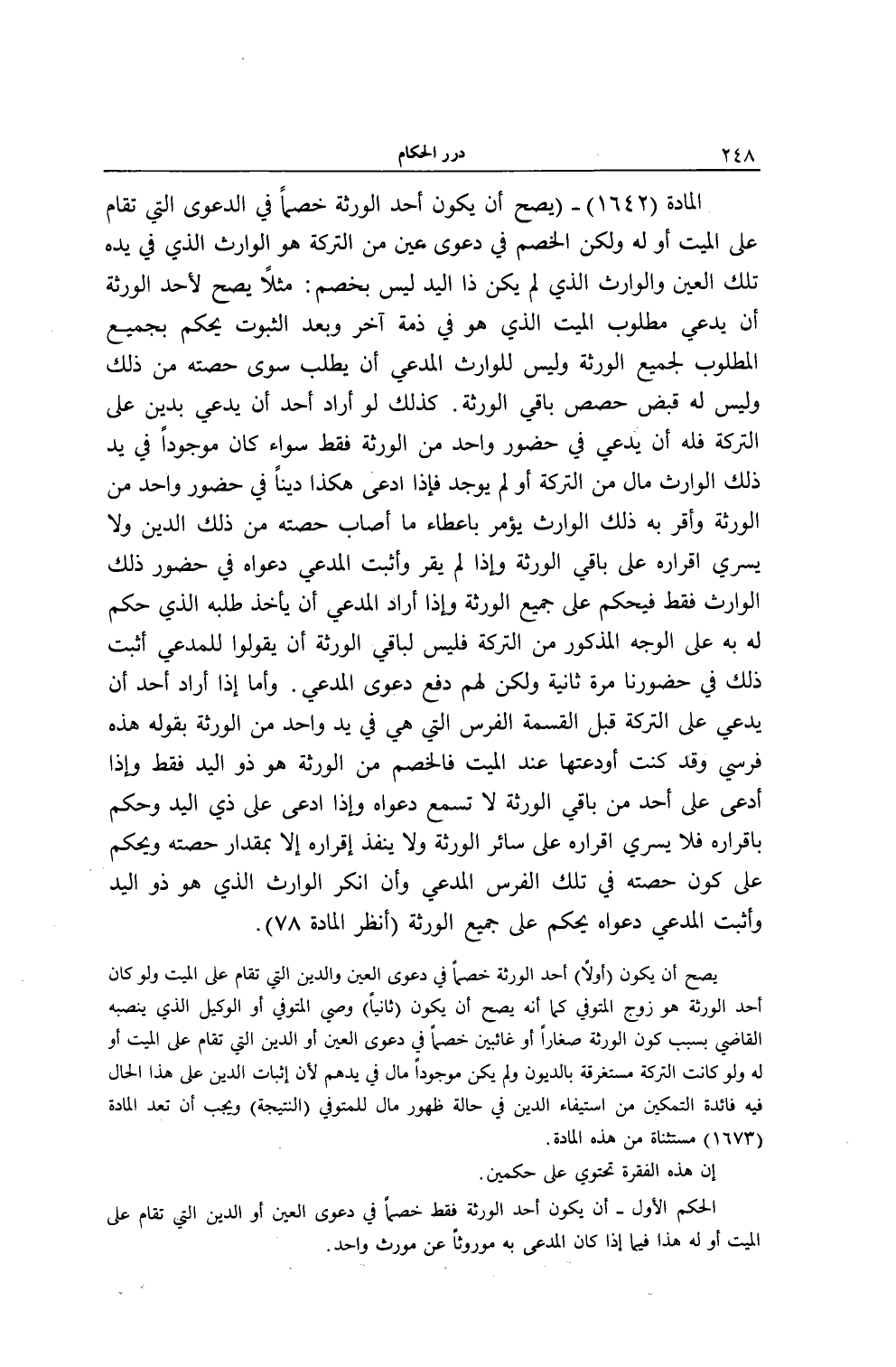 الْمَادَّةُ (1642) - (يَصِحُّ أَنْ يَكُونَ أَحَدُ الْوَرَثَةِ خَصْمًا فِي الدَّعْوَى الَّتِي تُقَامُ عَلَى الْمَيِّتِ أَوْ لَهُ وَلَكِنَّ الْخَصْمَ فِي دَعْوَى عَيْنٍ مِنْ التَّرِكَةِ هُوَ الْوَارِثُ الَّذِي فِي يَدِهِ تِلْكَ الْعَيْنُ. وَالْوَارِثُ الَّذِي لَمْ يَكُنْ ذَا الْيَدِ لَيْسَ بِخَصْمٍ: مَثَلًا يَصِحُّ لِأَحَدِ الْوَرَثَةِ أَنْ يَدَّعِيَ مَطْلُوبَ الْمَيِّتِ الَّذِي هُوَ فِي ذِمَّةِ آخَرَ وَبَعْدَ الثُّبُوتِ يُحْكَمُ بِجَمِيعِ الْمَطْلُوبِ لِجَمِيعِ الْوَرَثَةِ وَلَيْسَ لِلْوَارِثِ الْمُدَّعِي أَنْ يَطْلُبَ سِوَى حِصَّتِهِ مِنْ ذَلِكَ وَلَيْسَ لَهُ قَبْضُ حِصَصِ بَاقِي الْوَرَثَةِ. كَذَلِكَ لَوْ أَرَادَ أَحَدٌ أَنْ يَدَّعِيَ بِدَيْنٍ عَلَى التَّرِكَةِ فَلَهُ أَنْ يَدَّعِيَ فِي حُضُورِ وَاحِدٍ مِنْ الْوَرَثَةِ فَقَطْ سَوَاءٌ كَانَ مَوْجُودًا فِي يَدِ ذَلِكَ الْوَارِثِ مَالٌ مِنْ التَّرِكَةِ أَوْ لَمْ يُوجَدْ فَإِذَا ادَّعَى هَكَذَا دَيْنًا فِي حُضُورِ وَاحِدٍ مِنْ الْوَرَثَةِ وَأَقَرَّ بِهِ ذَلِكَ الْوَارِثُ يُؤْمَرُ بِإِعْطَاءِ مَا أَصَابَ حِصَّتَهُ مِنْ ذَلِكَ الدَّيْنِ وَلَا يَسْرِي إقْرَارُهُ عَلَى بَاقِي الْوَرَثَةِ وَإِذَا لَمْ يُقِرَّ وَأَثْبَتَ الْمُدَّعِي دَعْوَاهُ فِي حُضُورِ ذَلِكَ الْوَارِثِ فَقَطْ فَيُحْكَمُ عَلَى جَمِيعِ الْوَرَثَةِ وَإِذَا أَرَادَ الْمُدَّعِي أَنْ يَأْخُذَ طَلَبَهُ الَّذِي حُكِمَ لَهُ بِهِ عَلَى الْوَجْهِ الْمَذْكُورِ مِنْ التَّرِكَةِ فَلَيْسَ لِبَاقِي الْوَرَثَةِ أَنْ يَقُولُوا لِلْمُدَّعِي أَثْبِتْ ذَلِكَ فِي حُضُورِنَا مَرَّةً ثَانِيَةً وَلَكِنْ لَهُمْ دَفْعُ دَعْوَى الْمُدَّعِي. وَأَمَّا إذَا أَرَادَ أَحَدٌ أَنْ يَدَّعِيَ عَلَى التَّرِكَةِ قَبْلَ الْقِسْمَةِ الْفَرَسَ الَّتِي هِيَ فِي يَدِ وَاحِدٍ مِنْ الْوَرَثَةِ بِقَوْلِهِ هَذِهِ فَرَسِي وَقَدْ كُنْت أَوْدَعْتهَا عِنْدَ الْمَيِّتِ فَالْخَصْمُ مِنْ الْوَرَثَةِ هُوَ ذُو الْيَدِ فَقَطْ وَإِذَا ادَّعَى عَلَى أَحَدٍ مِنْ بَاقِي الْوَرَثَةِ لَا تُسْمَعُ دَعْوَاهُ وَإِذَا ادَّعَى عَلَى ذِي الْيَدِ وَحُكِمَ بِإِقْرَارِهِ فَلَا يَسْرِي إقْرَارُهُ عَلَى سَائِرِ الْوَرَثَةِ وَلَا يَنْفُذُ إقْرَارُهُ إلَّا بِمِقْدَارِ حِصَّتِهِ وَيُحْكَمُ عَلَى كَوْنِ حِصَّتِهِ فِي تِلْكَ الْفَرَسِ الْمُدَّعِي وَإِنْ أَنْكَرَ الْوَارِثُ الَّذِي هُوَ ذُو الْيَدِ وَأَثْبَتَ الْمُدَّعِي دَعْوَاهُ يُحْكَمُ عَلَى جَمِيعِ الْوَرَثَةِ) (اُنْظُرْ الْمَادَّةَ 78) . يَصِحُّ أَنْ يَكُونَ (أَوَّلًا) أَحَدُ الْوَرَثَةِ خَصْمًا فِي دَعْوَى الْعَيْنِ وَالدَّيْنِ الَّتِي تُقَامُ عَلَى الْمَيِّتِ وَلَوْ كَانَ أَحَدُ الْوَرَثَةِ هُوَ زَوْجَ الْمُتَوَفَّى كَمَا أَنَّهُ يَصِحُّ أَنْ يَكُونَ (ثَانِيًا) وَصِيُّ الْمُتَوَفَّى أَوْ الْوَكِيلُ الَّذِي يُنَصِّبُهُ الْقَاضِي بِسَبَبِ كَوْنِ الْوَرَثَةِ صِغَارًا أَوْ غَائِبًا خَصْمًا فِي دَعْوَى الْعَيْنِ أَوْ الدَّيْنِ الَّتِي تُقَامُ عَلَى الْمَيِّتِ أَوْ لَهُ وَلَوْ كَانَتْ التَّرِكَةُ مُسْتَغْرَقَةً بِالدُّيُونِ وَلَمْ يَكُنْ مَوْجُودًا مَالٌ فِي يَدِهِمْ لِأَنَّ إثْبَاتَ الدَّيْنِ عَلَى هَذَا الْحَالِ فِيهِ فَائِدَةُ التَّمْكِينِ مِنْ اسْتِيفَاءِ الدَّيْنِ فِي حَالَةِ ظُهُورِ مَالٍ لِلْمُتَوَفَّى (النَّتِيجَةُ) وَيَجِبُ أَنْ تُعَدَّ الْمَادَّةُ (1673) مُسْتَثْنَاةً مِنْ هَذِهِ الْمَادَّةِ.
