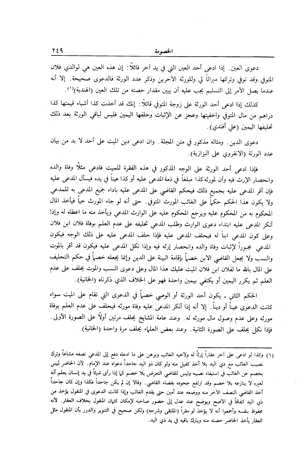 دَعْوَى الْعَيْنِ. إذَا ادَّعَى أَحَدٌ الْعَيْنَ الَّتِي فِي يَدِ آخَرَ قَائِلًا: إنَّ هَذِهِ الْعَيْنَ هِيَ لِوَالِدِي فُلَانٍ الْمُتَوَفَّى وَقَدْ تُوُفِّيَ وَتَرَكَهَا مِيرَاثًا لِي وَلِلْوَرَثَةِ الْآخَرِينَ وَذَكَرَ عَدَدَ الْوَرَثَةِ فَالدَّعْوَى صَحِيحَةٌ. إلَّا أَنَّهُ عِنْدَمَا يَصِلُ الْأَمْرُ إلَى التَّسْلِيمِ يَجِبُ عَلَيْهِ أَنْ يُبَيِّنَ مِقْدَارَ حِصَّتِهِ مِنْ تِلْكَ الْعَيْنِ (الْهِنْدِيَّةُ) كَذَلِكَ إذَا ادَّعَى أَحَدُ الْوَرَثَةِ عَلَى زَوْجَةِ الْمُتَوَفَّى قَائِلًا: إنَّك قَدْ أَخَذْت كَذَا أَشْيَاءَ قِيمَتُهَا كَذَا دَرَاهِمَ مِنْ مَالِ الْمُتَوَفَّى وَأَخْفَيْتهَا وَعَجَزَ عَنْ الْإِثْبَاتِ وَحَلَّفَهَا الْيَمِينَ فَلَيْسَ لِبَاقِي الْوَرَثَةِ بَعْدَ ذَلِكَ تَحْلِيفُهَا الْيَمِينَ (عَلِيٌّ أَفَنْدِي) . دَعْوَى الدَّيْنِ وَمِثَالُهُ مَذْكُورٌ فِي مَتْنِ الْمَجَلَّةِ. وَإِنْ ادَّعَى دِينَ الْمَيِّتِ عَلَى أَحَدٍ لَا بُدَّ مِنْ بَيَانِ عَدَدِ الْوَرَثَةِ (الْأَنْقِرْوِيُّ عَلَى الْبَزَّازِيَّةُ) . فَإِذَا ادَّعَى أَحَدُ الْوَرَثَةِ عَلَى الْوَجْهِ الْمَذْكُورِ فِي هَذِهِ الْفِقْرَةِ لِلْمَيِّتِ فَادَّعَى مَثَلًا وَفَاةَ وَالِدِهِ وَانْحِصَارَ الْإِرْثِ فِيهِ وَأَنَّ لِمُوَرِّثِهِ كَذَا مَبْلَغًا فِي ذِمَّةِ الْمُدَّعَى عَلَيْهِ أَوْ كَذَا عَيْنًا فِي يَدِهِ فَيَسْأَلُ الْمُدَّعَى عَلَيْهِ فَإِنْ أَقَرَّ الْمُدَّعَى عَلَيْهِ بِجَمِيعِ ذَلِكَ فَيَحْكُمُ الْقَاضِي عَلَى الْمُدَّعَى عَلَيْهِ بِأَدَاءِ جَمِيعِ الْمُدَّعَى بِهِ لِلْمُدَّعِي وَلَا يَكُونُ هَذَا الْحُكْمُ حُكْمًا عَلَى الْغَائِبِ الْمُوَرِّثِ الْمُتَوَفَّى. حَتَّى إنَّهُ لَوْ جَاءَ الْمُوَرِّثُ حَيًّا فَيَأْخُذُ الْمَالَ الْمَحْكُومَ بِهِ مِنْ الْمَحْكُومِ عَلَيْهِ وَيَرْجِعُ الْمَحْكُومُ عَلَيْهِ عَلَى الْوَارِثِ الْمُدَّعِي وَيَأْخُذُ مِنْهُ مَا أَعْطَاهُ لَهُ وَإِذَا أَنْكَرَ الْمُدَّعَى عَلَيْهِ ابْتِدَاءً دَعْوَى الْوَارِثِ، وَطَلَبَ الْمُدَّعِي تَحْلِيفَهُ عَلَى عَدَمِ الْعِلْمِ بِوَفَاةِ فُلَانِ ابْنِ فُلَانٍ وَعَلَى كَوْنِ الْمُدَّعِي ابْنًا لَهُ فَيَحْلِفُ الْمُدَّعَى عَلَيْهِ فَإِذَا حَلَفَ الْمُدَّعَى عَلَيْهِ عَلَى ذَلِكَ الْوَجْهِ فَيَكُونُ الْمُدَّعِي مَجْبُورًا لِإِثْبَاتِ وَفَاةِ وَالِدِهِ وَانْحِصَارِ إرْثِهِ فِيهِ وَإِذَا نَكَلَ الْمُدَّعَى عَلَيْهِ فَيَكُونُ قَدْ أَقَرَّ بِالْمَوْتِ وَالنَّسَبِ وَلَا يَجْعَلُ الْقَاضِي الِابْنَ خَصْمًا بِإِقَامَةِ الْبَيِّنَةِ عَلَى الدَّيْنِ وَإِنَّمَا يَجْعَلُهُ خَصْمًا فِي حُكْمِ التَّحْلِيفِ عَلَى الْمَالِ بِاَللَّهِ مَا لِفُلَانِ ابْنِ فُلَانٍ الْمَيِّتِ عَلَيْك هَذَا الْمَالُ وَعَلَى دَعْوَى النَّسَبِ وَالْمَوْتِ يَحْلِفُ عَلَى عَدَمِ الْعِلْمِ ثُمَّ يُكَرِّرُ الْيَمِينَ أَوْ يَكْتَفِي بِيَمِينٍ وَاحِدَةٍ فَهُوَ عَلَى الْخِلَافِ الَّذِي ذَكَرْنَاهُ (الْخَانِيَّةُ) .