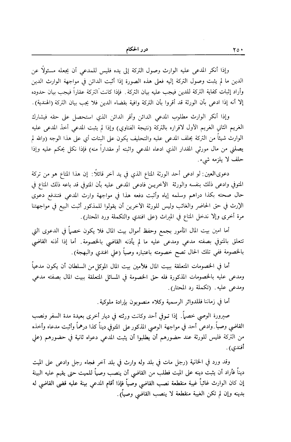 دَعْوَى الْعَيْنِ: لَوْ ادَّعَى أَحَدُ الْوَرَثَةِ الْمَتَاعَ الَّذِي فِي يَدِ آخَرَ قَائِلًا: إنَّ هَذَا الْمَتَاعَ هُوَ مِنْ تَرِكَةِ الْمُتَوَفَّى وَادَّعَى ذَلِكَ بِنَفْسِهِ وَالْوَرَثَةِ الْآخَرِينَ فَادَّعَى الْمُدَّعَى عَلَيْهِ بِأَنَّ الْمُتَوَفَّى قَدْ بَاعَهُ ذَلِكَ الْمَتَاعَ فِي حَالٍ صِحَّتِهِ بِكَذَا دَرَاهِمَ وَسَلَّمَهُ إيَّاهُ وَأَثْبَتَ. دَفَعَهُ هَذَا فِي مُوَاجَهَةِ وَارِثِ الْمُدَّعِي فَتَنْدَفِعُ دَعْوَى الْإِرْثِ فِي حَقِّ الْحَاضِرِ وَالْغَائِبِ وَلَيْسَ لِلْوَرَثَةِ الْآخَرِينَ أَنْ يَقُولُوا لِلْمَذْكُورِ أَثْبِتْ الْبَيْعَ فِي مُوَاجَهَتِنَا مَرَّةً أُخْرَى وَإِلَّا نُدْخِلْ الْمَتَاعَ فِي الْمِيرَاثِ (عَلِيٌّ أَفَنْدِي وَالتَّكْمِلَةُ وَرَدُّ الْمُحْتَارِ) . أَمَّا أَمِينُ بَيْتِ الْمَالِ الْمَأْمُورُ بِجَمْعِ وَحِفْظِ أَمْوَالِ بَيْتِ الْمَالِ فَلَا يَكُونُ خَصْمًا فِي الدَّعْوَى الَّتِي تَتَعَلَّقُ بِالْمُتَوَفَّى بِصِفَتِهِ مُدَّعِيًا وَمُدَّعًى عَلَيْهِ مَا لَمْ يَأْذَنْهُ الْقَاضِي بِالْخُصُومَةِ. أَمَّا إذَا أَذِنَهُ الْقَاضِي بِالْخُصُومَةِ فَفِي تِلْكَ الْحَالِ تَصِحُّ خُصُومَتُهُ بِاعْتِبَارِهِ وَصِيًّا (عَلِيٌّ أَفَنْدِي وَالْبَهْجَةُ) . أَمَّا فِي الْخُصُومَاتِ الْمُتَعَلِّقَةِ بِبَيْتِ الْمَالِ فَلِأَمِينِ بَيْتِ الْمَالِ الْمُوَكَّلِ مِنْ السُّلْطَانِ أَنْ يَكُونَ مُدَّعِيًا وَمُدَّعًى عَلَيْهِ بِالْخُصُومَاتِ الْمَذْكُورَةِ فَلَهُ حَقُّ الْخُصُومَةِ فِي الْمَسَائِلِ الْمُتَعَلِّقَةِ بِبَيْتِ الْمَالِ بِصِفَتِهِ مُدَّعِيًا وَمُدَّعًى عَلَيْهِ. (تَكْمِلَةُ رَدِّ الْمُحْتَارِ) . أَمَّا فِي زَمَانِنَا فَلِلدَّوَائِرِ الرَّسْمِيَّةِ وُكَلَاءُ مَنْصُوبُونَ بِإِرَادَةٍ مُلُوكِيَّةِ.