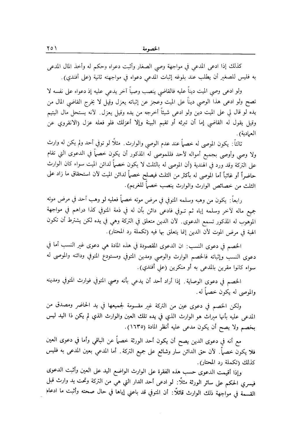 الْخَصْمُ فِي دَعْوَى النَّسَبِ: إنَّ الدَّعْوَى الْمَقْصُودَةَ فِي هَذِهِ الْمَادَّةِ هِيَ دَعْوَى غَيْرِ النَّسَبِ أَمَّا فِي دَعْوَى النَّسَبِ وَإِثْبَاتِهِ فَالْخَصْمُ الْوَارِثُ وَالْوَصِيُّ وَمَدِينُ الْمُتَوَفَّى وَمُسْتَوْدَعُ الْمُتَوَفَّى وَدَائِنُهُ وَالْمُوصَى لَهُ سَوَاءٌ كَانُوا مُقِرِّينَ بِالْمُدَّعَى بِهِ أَوْ مُنْكِرِينَ (عَلِيٌّ أَفَنْدِي) . الْخَصْمُ فِي دَعْوَى الْوِصَايَةِ.