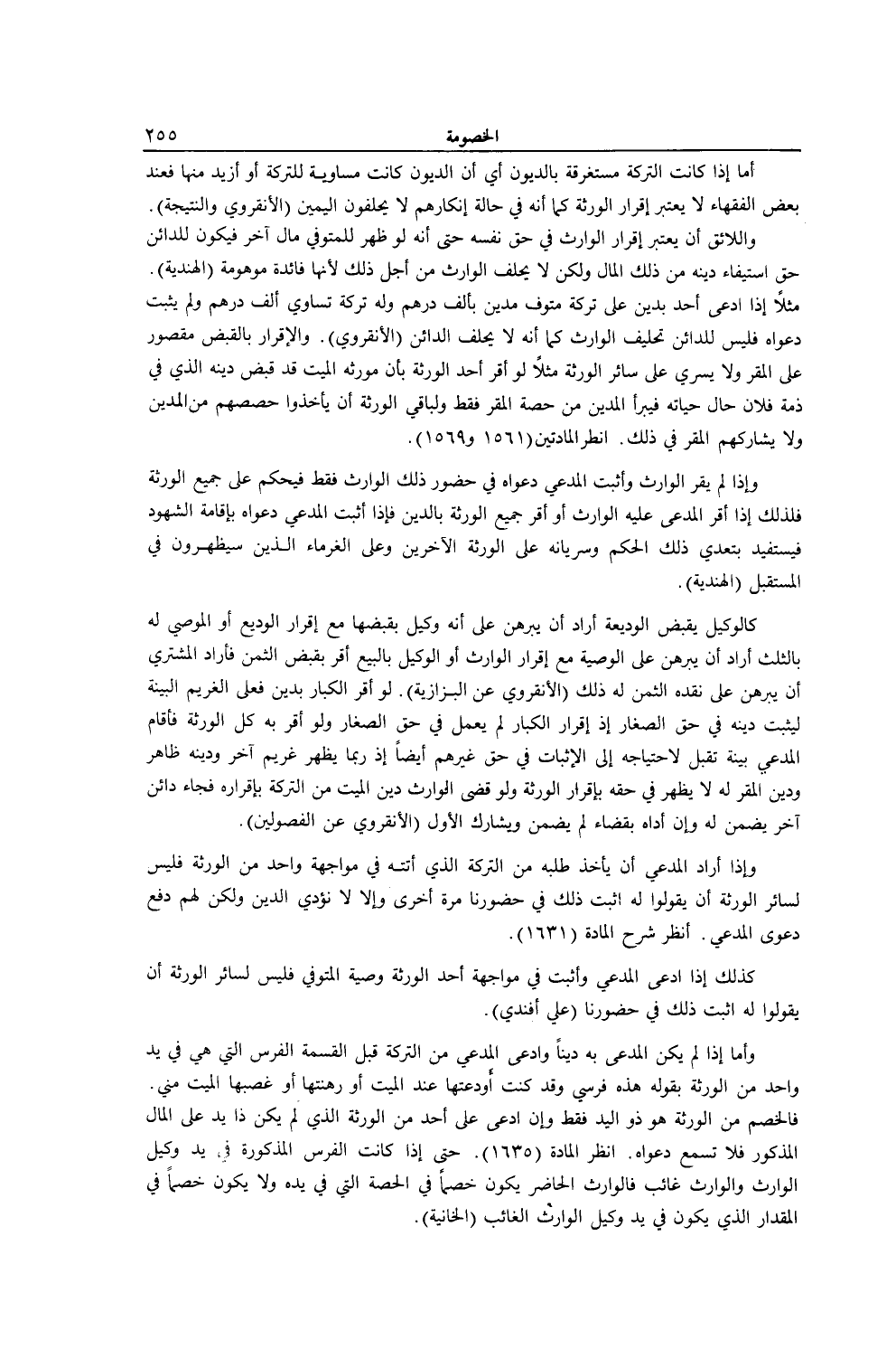 مَثَلًا إذَا ادَّعَى أَحَدٌ بِدَيْنٍ عَلَى تَرِكَةِ مُتَوَفٍّ مَدِينٍ بِأَلْفِ دِرْهَمٍ وَلَهُ تَرِكَةٌ تُسَاوِي أَلْفَ دِرْهَمٍ وَلَمْ يُثْبِتْ دَعْوَاهُ فَلَيْسَ لِلدَّائِنِ تَحْلِيفُ الْوَارِثِ كَمَا أَنَّهُ لَا يَحْلِفُ الدَّائِنُ (الْأَنْقِرْوِيُّ) . وَالْإِقْرَارُ بِالْقَبْضِ مَقْصُورٌ عَلَى الْمُقِرِّ وَلَا يَسْرِي عَلَى سَائِرِ الْوَرَثَةِ مَثَلًا لَوْ أَقَرَّ أَحَدُ الْوَرَثَةِ بِأَنَّ مُوَرِّثَهُ الْمَيِّتَ قَدْ قَبَضَ دَيْنَهُ الَّذِي فِي ذِمَّةِ فُلَانٍ حَالَ حَيَاتِهِ فَيَبْرَأُ الْمَدِينُ مِنْ حِصَّةِ الْمُقِرِّ فَقَطْ وَلِبَاقِي الْوَرَثَةِ أَنْ يَأْخُذُوا حِصَصَهُمْ مِنْ الْمَدِينِ وَلَا يُشَارِكُهُمْ الْمُقِرُّ فِي ذَلِكَ. اُنْظُرْ الْمَادَّتَيْنِ (1561 و 1569) . وَإِذَا لَمْ يُقِرَّ الْوَارِثُ وَأَثْبَتَ الْمُدَّعِي دَعْوَاهُ فِي حُضُورِ ذَلِكَ الْوَارِثِ فَقَطْ فَيَحْكُمُ عَلَى جَمِيعِ الْوَرَثَةِ فَلِذَلِكَ إذَا أَقَرَّ الْمُدَّعَى عَلَيْهِ الْوَارِثُ أَوْ أَقَرَّ جَمِيعُ الْوَرَثَةِ بِالدَّيْنِ فَإِذَا أَثْبَتَ الْمُدَّعِي دَعْوَاهُ بِإِقَامَةِ الشُّهُودِ فَيَسْتَفِيدُ بِتَعَدِّي ذَلِكَ الْحُكْمِ وَسَرَيَانِهِ عَلَى الْوَرَثَةِ الْآخَرِينَ وَعَلَى الْغُرَمَاءِ الَّذِينَ سَيَظْهَرُونَ فِي الْمُسْتَقْبَلِ (الْهِنْدِيَّةُ) . كَالْوَكِيلِ يَقْبِضُ الْوَدِيعَةَ أَرَادَ أَنْ يُبَرْهِنَ عَلَى أَنَّهُ وَكِيلٌ بِقَبْضِهَا مَعَ إقْرَارِ الْوَدِيعِ أَوْ الْمُوصِي لَهُ بِالثُّلُثِ أَرَادَ أَنْ يُبَرْهِنَ عَلَى الْوَصِيَّةِ مَعَ إقْرَارِ الْوَارِثِ أَوْ الْوَكِيلِ بِالْبَيْعِ أَقَرَّ بِقَبْضِ الثَّمَنِ فَأَرَادَ الْمُشْتَرِي أَنْ يُبَرْهِنَ عَلَى نَقْدِهِ الثَّمَنَ لَهُ ذَلِكَ (الْأَنْقِرْوِيُّ عَنْ الْبَزَّازِيَّةُ) .