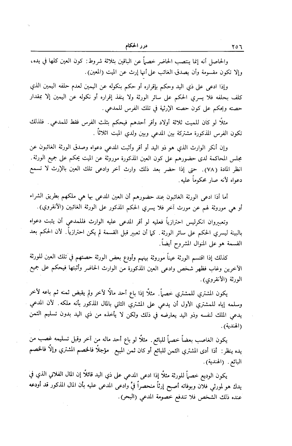 وَإِنْ أَنْكَرَ الْوَارِثُ الَّذِي هُوَ ذُو الْيَدِ أَوْ أَقَرَّ وَأَثْبَتَ الْمُدَّعِي دَعْوَاهُ وَصَدَّقَ الْوَرَثَةُ الْغَائِبُونَ عَنْ مَجْلِسِ الْمُحَاكَمَةِ لَدَى حُضُورِهِمْ عَلَى كَوْنِ الْعَيْنِ الْمَذْكُورَةِ مَوْرُوثَةً عَنْ الْمَيِّتِ يَحْكُمُ عَلَى جَمِيعِ الْوَرَثَةِ. اُنْظُرْ الْمَادَّة (78) . حَتَّى إذَا حَضَرَ بَعْدَ ذَلِكَ وَارِثٌ آخَرُ وَادَّعَى تِلْكَ الْعَيْنَ بِالْإِرْثِ لَا تُسْمَعُ دَعْوَاهُ لِأَنَّهُ صَارَ مَحْكُومًا عَلَيْهِ. أَمَّا إذَا ادَّعَى الْوَرَثَةُ الْغَائِبُونَ عِنْدَ حُضُورِهِمْ أَنَّ الْعَيْنَ الْمُدَّعَى بِهَا هِيَ مِلْكُهُمْ بِطَرِيقِ الشِّرَاءِ أَوْ هِيَ مَوْرُوثَةٌ لَهُمْ عَنْ مُوَرِّثٍ آخَرَ فَلَا يَسْرِي الْحُكْمُ الْمَذْكُورُ عَلَى الْوَرَثَةِ الْغَائِبِينَ (الْأَنْقِرْوِيُّ) . وَتَعْبِيرُ وَإِنْ أَنْكَرَ لَيْسَ احْتِرَازِيًّا فَعَلَيْهِ لَوْ أَقَرَّ الْمُدَّعَى عَلَيْهِ الْوَارِثُ فَلِلْمُدَّعِي أَنْ يُثْبِتَ دَعْوَاهُ بِالْبَيِّنَةِ لِيَسْرِيَ الْحُكْمُ عَلَى سَائِرِ الْوَرَثَةِ. كَمَا أَنَّ تَعْبِيرَ قَبْلَ الْقِسْمَةِ لَمْ يَكُنْ احْتِرَازِيًّا. لِأَنَّ الْحُكْمَ بَعْدَ الْقِسْمَةِ هُوَ عَلَى الْمِنْوَالِ الْمَشْرُوحِ أَيْضًا. كَذَلِكَ إذَا اقْتَسَمَ الْوَرَثَةُ عَيْنًا مَوْرُوثَةً بَيْنَهُمْ وَأَوْدَعَ بَعْضُ الْوَرَثَةِ حِصَّتَهُمْ فِي تِلْكَ الْعَيْنِ لِلْوَرَثَةِ الْآخَرِينَ وَغَابَ فَظَهَرَ شَخْصٌ وَادَّعَى الْعَيْنَ الْمَذْكُورَةَ مِنْ الْوَارِثِ الْحَاضِرِ وَأَثْبَتَهَا فَيُحْكَمُ عَلَى جَمِيعِ الْوَرَثَةِ (الْأَنْقِرْوِيُّ) . يَكُونُ الْمُشْتَرِي لِلْمُشْتَرِي خَصْمًا مَثَلًا إذَا بَاعَ أَحَدٌ مَالًا لِآخَرَ وَلَمْ يَقْبِضْ ثَمَنَهُ ثُمَّ بَاعَهُ لِآخَرَ وَسَلَّمَهُ إيَّاهُ لِلْمُشْتَرِي الْأَوَّلِ أَنْ يَدَّعِيَ عَلَى الْمُشْتَرِي الثَّانِي بِالْمَالِ الْمَذْكُورِ بِأَنَّهُ مِلْكُهُ؛ لِأَنَّ الْمُدَّعِيَ يَدَّعِي الْمِلْكَ لِنَفْسِهِ وَذُو الْيَدِ يُعَارِضُهُ فِي ذَلِكَ وَلَكِنْ لَا يَأْخُذُهُ مِنْ ذِي الْيَدِ بِدُونِ تَسْلِيمِ الثَّمَنِ (الْهِنْدِيَّةُ) . يَكُونُ الْغَاصِبُ بَعْضًا خَصْمًا لِلْبَائِعِ. مَثَلًا لَوْ بَاعَ أَحَدٌ مَالَهُ مِنْ آخَرَ وَقَبْلَ تَسْلِيمِهِ غُصِبَ مِنْ يَدِهِ يَنْظُرُ: أَذَا أَدَّى الْمُشْتَرِي الثَّمَنَ لِلْبَائِعِ أَوْ كَانَ ثَمَنُ الْمَبِيعِ مُؤَجَّلًا فَالْخَصْمُ الْمُشْتَرِي وَإِلَّا فَالْخَصْمُ الْبَائِعُ. (الْهِنْدِيَّةُ) . يَكُونُ الْوَدِيعُ خَصْمًا لِلْوَرَثَةِ مَثَلًا إذَا ادَّعَى الْمُدَّعِي عَلَى ذِي الْيَدِ قَائِلًا إنَّ الْمَالَ الْفُلَانِيَّ الَّذِي فِي يَدِك هُوَ لِمُوَرِّثِي فُلَانٍ وَبِوَفَاتِهِ أَصْبَحَ إرْثًا مُنْحَصِرًا فِي وَادَّعَى الْمُدَّعَى عَلَيْهِ بِأَنَّ الْمَالَ الْمَذْكُورَ قَدْ أَوْدَعَهُ عِنْدَهُ ذَلِكَ الشَّخْصُ فَلَا تَنْدَفِعُ خُصُومَةُ الْمُدَّعِي (الْبَحْرُ) . .