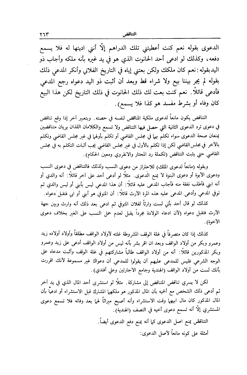 الدَّعْوَى بِقَوْلِهِ نَعَمْ كُنْتَ أَعْطَيْتنِي تِلْكَ الدَّرَاهِمَ إلَّا أَنَّنِي أَدَّيْتُهَا لَهُ فَلَا يُسْمَعُ دَفْعُهُ، وَكَذَلِكَ لَوْ ادَّعَى أَحَدٌ الْحَانُوتَ الَّذِي هُوَ فِي يَدِ غَيْرِهِ بِأَنَّهُ مِلْكُهُ وَأَجَابَ ذُو الْيَدِ بِقَوْلِهِ: نَعَمْ كَانَ مِلْكَك وَلَكِنْ بِعْتنِي إيَّاهُ فِي التَّارِيخِ الْفُلَانِيِّ وَأَنْكَرَ الْمُدَّعِي ذَلِكَ بِقَوْلِهِ لَمْ يَجْرِ بَيْنَنَا بَيْعٌ وَلَا شِرَاءٌ قَطُّ وَبَعْدَ أَنْ أَثْبَتَ ذُو الْيَدِ دَعْوَاهُ رَجَعَ الْمُدَّعِي فَادَّعَى قَائِلًا. نَعَمْ كُنْتُ بِعْت لَك ذَلِكَ الْحَانُوتَ فِي ذَلِكَ التَّارِيخِ لَكِنَّ هَذَا الْبَيْعَ كَانَ وَفَاءً أَوْ بِشَرْطٍ مُفْسِدٍ هُوَ كَذَا فَلَا يُسْمَعُ) . التَّنَاقُضُ يَكُونُ مَانِعًا لِدَعْوَى مِلْكِيَّةِ الْمُنَاقِضِ لِنَفْسِهِ فِي حِصَّتِهِ. وَبِتَعْبِيرٍ آخَرَ إذَا وَقَعَ تَنَاقُضٌ فِي دَعْوَى تُرَدُّ الدَّعْوَى الثَّانِيَةُ الَّتِي حَصَلَ فِيهَا التَّنَاقُضُ وَلَا تُسْمَعُ وَالْكَلَامَانِ اللَّذَانِ يُرَيَانِ مُتَنَاقِضَيْنِ يَمْنَعَانِ صِحَّةَ الدَّعْوَى سَوَاءٌ تَكَلَّمَ بِهِمَا فِي مَجْلِسِ الْقَاضِي أَوْ تَكَلَّمَ بِأَوَّلِهِمَا فِي غَيْرِ مَجْلِسِ الْقَاضِي وَتَكَلَّمَ بِالْآخَرِ فِي مَجْلِسِ الْقَاضِي لَكِنْ إذَا تَكَلَّمَ بِالْأَوَّلِ فِي غَيْرِ مَجْلِسِ الْقَاضِي يَجِبُ إثْبَاتُ التَّكَلُّمِ بِهِ فِي مَجْلِسِ الْقَاضِي حَتَّى يَثْبُتَ التَّنَاقُضُ (تَكْمِلَةُ رَدِّ الْمُحْتَارِ وَالْأَنْقِرْوِيُّ وَمُعِينُ الْحُكَّامِ) . وَبِقَوْلِهِ (مَانِعًا لِدَعْوَى الْمِلْكِ) لِلِاحْتِرَازِ مِنْ دَعْوَى النَّسَبِ وَلِذَلِكَ فَالتَّنَاقُضُ فِي دَعْوَى النَّسَبِ وَدَعْوَى الْأُبُوَّةِ أَوْ دَعْوَى الْبُنُوَّةِ لَا يَمْنَعُ الدَّعْوَى. مَثَلًا لَوْ ادَّعَى أَحَدٌ عَلَى آخَرَ قَائِلًا: إنَّهُ وَالِدِي أَوْ إنَّهُ ابْنِي فَأَطْلُبُ نَفَقَةً مِنْهُ فَأَجَابَ الْمُدَّعَى عَلَيْهِ قَائِلًا: إنَّ هَذَا الْمُدَّعِيَ لَيْسَ بِابْنِي أَوْ لَيْسَ وَالِدِي ثُمَّ تُوُفِّيَ الْمُدَّعِي وَادَّعَى الْمُدَّعَى عَلَيْهِ هَذِهِ الْمَرَّةَ الْإِرْثَ قَائِلًا: إنَّ الْمُتَوَفَّى هُوَ ابْنِي أَوْ أَبِي فَتُقْبَلُ دَعْوَاهُ. كَذَلِكَ لَوْ قَالَ أَحَدٌ بِأَنِّي لَسْت وَارِثًا لِفُلَانٍ الْمُتَوَفَّى ثُمَّ ادَّعَى بَعْدَ ذَلِكَ أَنَّهُ وَارِثٌ وَبَيَّنَ جِهَةَ الْإِرْثِ فَتُقْبَلُ دَعْوَاهُ (لِأَنَّ ادِّعَاءَ الْوِلَادَةِ مُجَرَّدًا يُقْبَلُ لِعَدَمِ حَمْلِ النَّسَبِ عَلَى الْغَيْرِ بِخِلَافِ دَعْوَى الْأُخُوَّةِ) .
