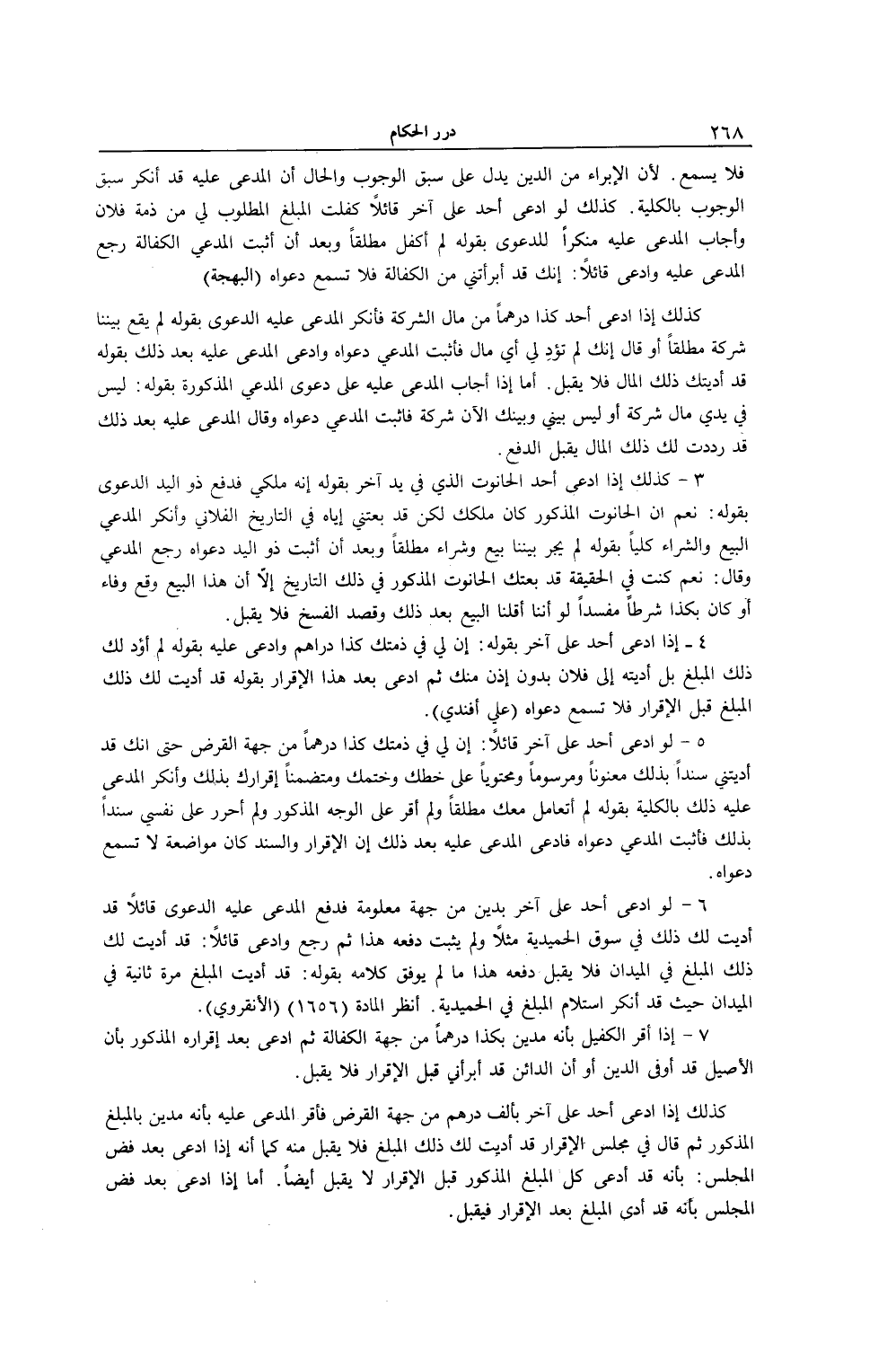6 - لَوْ ادَّعَى أَحَدٌ عَلَى آخَرَ بِدَيْنٍ مِنْ جِهَةٍ مَعْلُومَةٍ فَدَفَعَ الْمُدَّعَى عَلَيْهِ الدَّعْوَى قَائِلًا قَدْ أَدَّيْت لَك ذَلِكَ فِي سُوقِ الْحَمِيدِيَّةِ مَثَلًا وَلَمْ يُثْبِتْ دَفْعَهُ هَذَا ثُمَّ رَجَعَ وَادَّعَى قَائِلًا: قَدْ أَدَّيْت لَك ذَلِكَ الْمَبْلَغَ فِي الْمَيْدَانِ فَلَا يُقْبَلُ دَفْعُهُ هَذَا مَا لَمْ يُوَفِّقْ كَلَامُهُ بِقَوْلِهِ: قَدْ أَدَّيْت الْمَبْلَغَ مَرَّةً ثَانِيَةً فِي الْمَيْدَانِ حَيْثُ قَدْ أَنْكَرَ اسْتِلَامَ الْمَبْلَغِ فِي الْحَمِيدِيَّة. اُنْظُرْ الْمَادَّةَ (1656) (الْأَنْقِرْوِيُّ) .