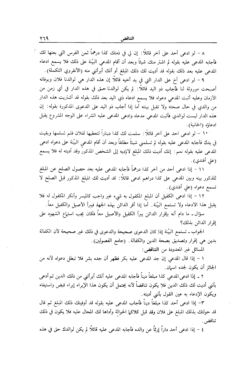 2 - إذَا ادَّعَى الْمُدَّعِي كَذَا مَبْلَغًا دَيْنًا فَأَجَابَهُ الْمُدَّعَى عَلَيْهِ إنَّكَ أَبْرَأْتنِي مِنْ ذَلِكَ الدَّيْنِ ثُمَّ ادَّعَى بِأَنَّنِي أَدَّيْت لَك ذَلِكَ الدَّيْنَ فَلَا يَكُونُ تَنَاقُضًا لِأَنَّهُ يُحْتَمَلُ أَنْ يَكُونَ هَذَا الْإِبْرَاءُ إبْرَاءَ قَبْضٍ وَاسْتِيفَاءٍ وَيَكُونُ الِادِّعَاءُ بِهِ عَيْنُ الْقَوْلِ بِأَنَّنِي أَدَّيْته.