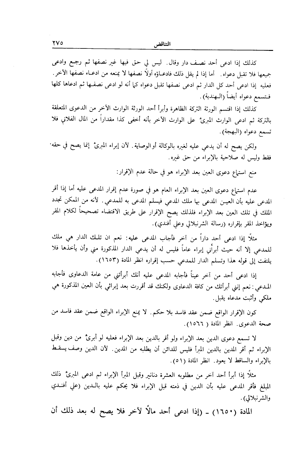 مَثَلًا إذَا ادَّعَى أَحَدٌ دَارًا مِنْ آخَرَ فَأَجَابَ الْمُدَّعَى عَلَيْهِ: نَعَمْ إنَّ تِلْكَ الدَّارَ هِيَ مِلْكٌ لِلْمُدَّعِي إلَّا أَنَّهُ حَيْثُ أَبْرَأَنِي إبْرَاءً عَامًّا فَلَيْسَ لَهُ أَنْ يَدَّعِيَ الدَّارَ الْمَذْكُورَةَ مِنِّي وَأَنْ يَأْخُذَهَا فَلَا يُلْتَفَتُ إلَى قَوْلِهِ هَذَا وَتُسَلَّمُ الدَّارُ لِلْمُدَّعِي حَسَبَ إقْرَارِهِ اُنْظُرْ الْمَادَّةَ (1653) . إذَا ادَّعَى أَحَدٌ مِنْ آخَرَ عَيْنًا فَأَجَابَهُ الْمُدَّعَى عَلَيْهِ إنَّكَ أَبْرَأْتنِي مِنْ عَامَّةِ الدَّعَاوَى فَأَجَابَهُ الْمُدَّعِي: نَعَمْ إنَّنِي أَبْرَأْتُك مِنْ كَافَّةِ الدَّعَاوَى وَلَكِنَّك قَدْ أَقْرَرْت بَعْدَ إبْرَائِي بِأَنَّ الْعَيْنَ الْمَذْكُورَةَ هِيَ مِلْكِي وَأَثْبَتَ مُدَّعَاهُ يُقْبَلُ كَوْنُ الْإِقْرَارِ الْوَاقِعِ ضِمْنَ عَقْدٍ فَاسِدٍ بِلَا حُكْمٍ. لَا يَمْنَعُ الْإِبْرَاءَ الْوَاقِعَ ضِمْنَ عَقْدٍ فَاسِدٍ مِنْ صِحَّةِ الدَّعْوَى. اُنْظُرْ الْمَادَّةَ (1566) .
