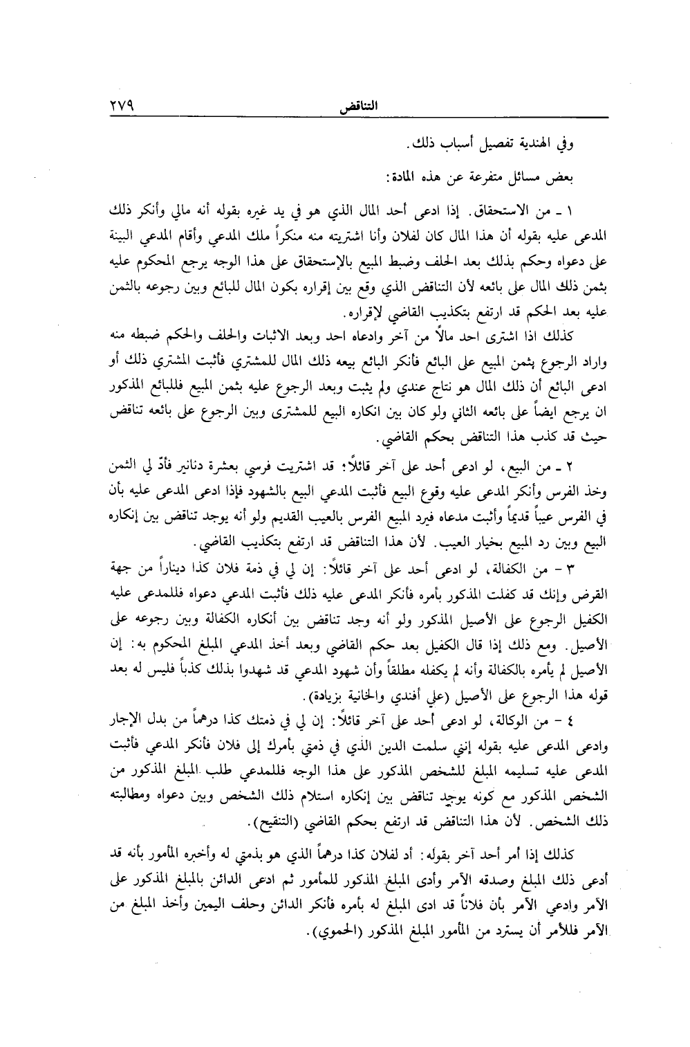 2 - مِنْ الْبَيْعِ، لَوْ ادَّعَى أَحَدٌ عَلَى آخَرَ قَائِلًا: قَدْ اشْتَرَيْت فَرَسِي بِعَشَرَةِ دَنَانِيرَ فَأَدِّ لِي الثَّمَنَ وَخُذْ الْفَرَسَ وَأَنْكَرَ الْمُدَّعَى عَلَيْهِ وُقُوعَ الْبَيْعِ فَأَثْبَتَ الْمُدَّعِي الْبَيْعَ بِالشُّهُودِ فَإِذَا ادَّعَى الْمُدَّعَى عَلَيْهِ بِأَنَّ فِي الْفَرَسِ عَيْبًا قَدِيمًا وَأَثْبَتَ مُدَّعَاهُ فَيُرَدُّ الْمَبِيعُ الْفَرَسُ بِالْعَيْبِ الْقَدِيمِ وَلَوْ أَنَّهُ يُوجَدُ تَنَاقُضٌ بَيْنَ إنْكَارِهِ الْبَيْعَ وَبَيْنَ رَدِّ الْمَبِيعِ بِخِيَارِ الْعَيْبِ. لِأَنَّ هَذَا التَّنَاقُضَ قَدْ ارْتَفَعَ بِتَكْذِيبِ الْقَاضِي.