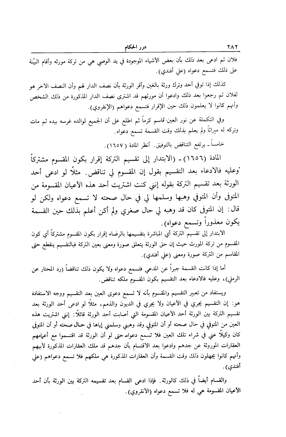 أَمَّا إذَا كَانَتْ الْقِسْمَةُ جَبْرًا عَنْ الْمُدَّعِي فَتُسْمَعُ دَعْوَاهُ وَلَا يَكُونُ ذَلِكَ تَنَاقُضًا (رَدُّ الْمُحْتَارِ عَنْ الرَّمْلِيِّ) وَعَلَيْهِ فَالِادِّعَاءُ بَعْدَ التَّقْسِيمِ بِكَوْنِ الْمَقْسُومِ مِلْكَهُ تَنَاقُضٌ. وَيُسْتَفَادُ مِنْ تَعْبِيرِ التَّقْسِيمِ وَالْمَقْسُومِ بِأَنَّهُ لَا تُسْمَعُ دَعْوَى الْعَيْنِ بَعْدَ التَّقْسِيمِ وَوَجْهُ الِاسْتِفَادَةِ هُوَ أَنَّ التَّقْسِيمَ يَجْرِي فِي الْأَعْيَانِ وَلَا يَجْرِي فِي الدُّيُونِ وَالذِّمَمِ، مَثَلًا لَوْ ادَّعَى أَحَدُ الْوَرَثَةِ بَعْدَ تَقْسِيمِ التَّرِكَة بَيْنَ الْوَرَثَةِ أَحَدَ الْأَعْيَانِ الْمَقْسُومَةِ الَّتِي أَصَابَتْ أَحَدَ الْوَرَثَةِ قَائِلًا: إنَّنِي اشْتَرَيْت هَذِهِ الْعَيْنَ مِنْ الْمُتَوَفَّى فِي حَالِ صِحَّتِهِ أَوْ أَنَّ الْمُتَوَفَّى قَدْ وَهَبَنِي وَسَلَّمَنِي إيَّاهَا فِي حَالِ صِحَّتِهِ أَوْ أَنَّ الْمُتَوَفَّى كَانَ وَكِيلًا عَنِّي فِي شِرَاءِ تِلْكَ الْعَيْنِ فَلَا تُسْمَعُ دَعْوَاهُ، حَتَّى لَوْ أَنَّ الْوَرَثَةَ قَدْ اقْتَسَمُوا مَعَ أَعْمَامِهِمْ الْعَقَارَاتِ الْمَوْرُوثَةَ عَنْ جَدِّهِمْ وَادَّعَوْا بَعْدَ الِاقْتِسَامِ بِأَنَّ جَدَّهُمْ قَدْ مَلَكَ الْعَقَارَاتِ الْمَذْكُورَةَ لِأَبِيهِمْ وَأَنَّهُمْ كَانُوا يَجْهَلُونَ ذَلِكَ وَقْتَ الْقِسْمَةِ وَأَنَّ الْعَقَارَاتِ الْمَذْكُورَةَ هِيَ مِلْكُهُمْ فَلَا تُسْمَعُ دَعْوَاهُمْ (عَلِيٌّ أَفَنْدِي) . وَالْقَسَّامُ أَيْضًا فِي ذَلِكَ كَالْوَرَثَةِ. فَإِذَا ادَّعَى الْقَسَّامُ بَعْدَ تَقْسِيمِهِ التَّرِكَةَ بَيْنَ الْوَرَثَةِ بِأَنَّ أَحَدَ الْأَعْيَانِ الْمَقْسُومَةِ هِيَ لَهُ فَلَا تُسْمَعُ دَعْوَاهُ (الْأَنْقِرْوِيُّ) .