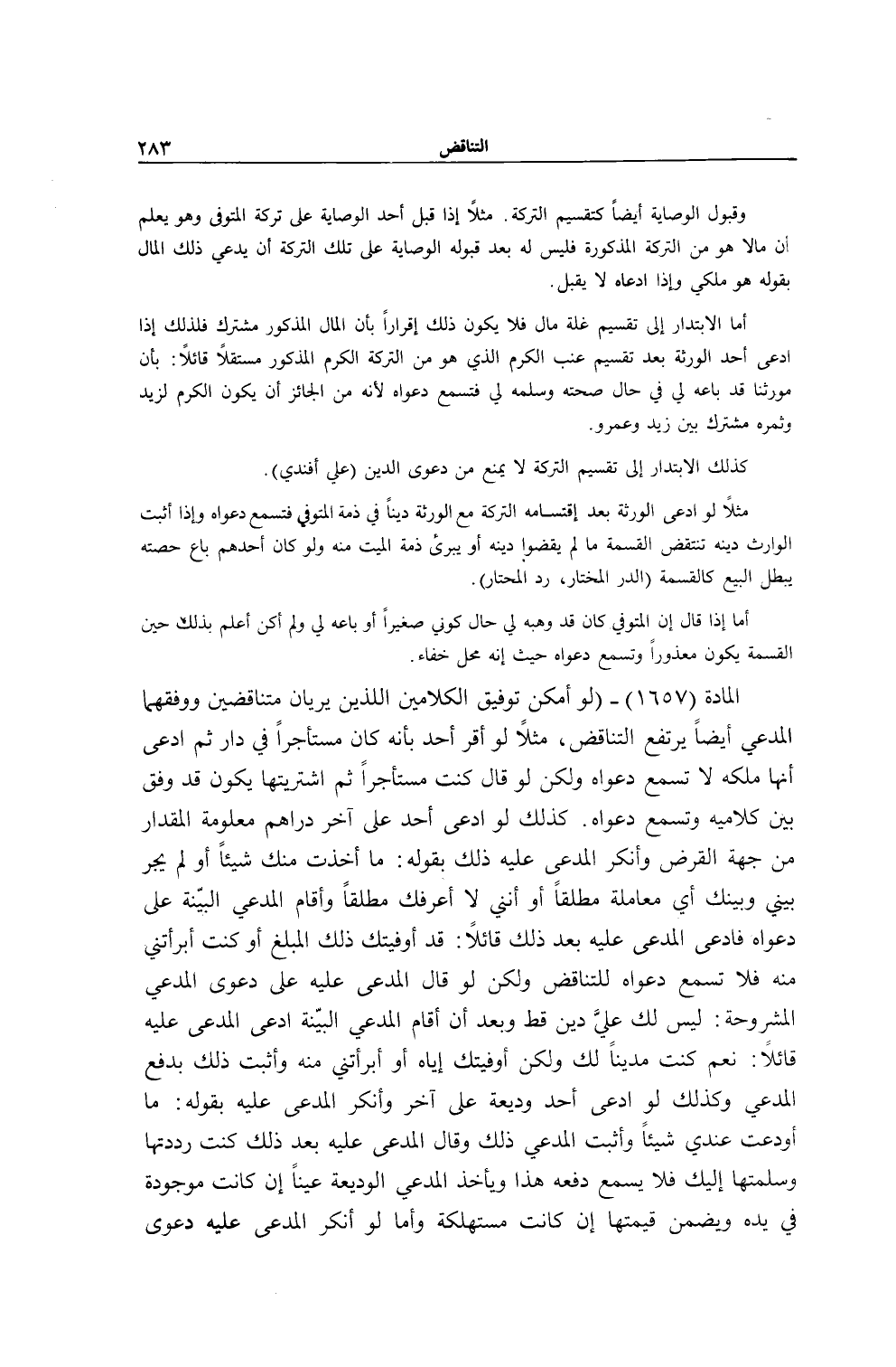 [ (الْمَادَّةُ 1657) لَوْ أَمْكَنَ تَوْفِيقُ الْكَلَامَيْنِ اللَّذَيْنِ يُرَيَانِ مُتَنَاقِضَيْنِ وَوَفَّقَهُمَا الْمُدَّعِي]