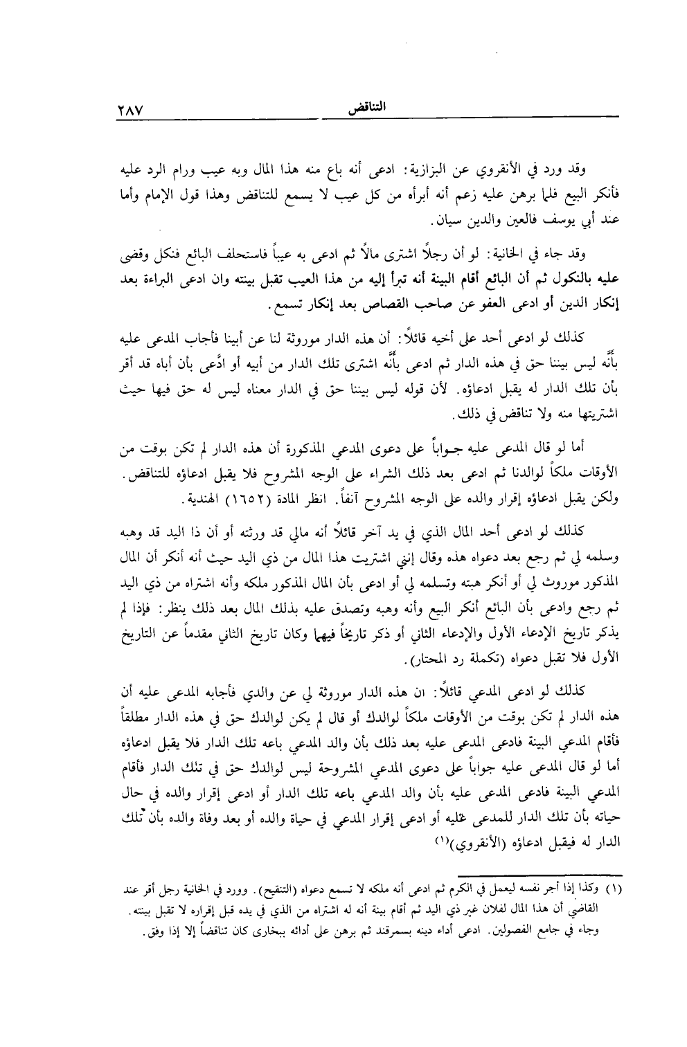 كَذَلِكَ لَوْ ادَّعَى أَحَدٌ عَلَى أَخِيهِ قَائِلًا: إنَّ هَذِهِ الدَّارَ مَوْرُوثَةٌ لَنَا عَنْ أَبِينَا فَأَجَابَ الْمُدَّعَى عَلَيْهِ بِأَنَّهُ لَيْسَ بَيْنَنَا حَقٌّ فِي هَذِهِ الدَّارِ ثُمَّ ادَّعَى بِأَنَّهُ اشْتَرَى تِلْكَ الدَّارَ مِنْ أَبِيهِ أَوْ ادَّعَى بِأَنَّ أَبَاهُ قَدْ أَقَرَّ بِأَنَّ تِلْكَ الدَّارَ لَهُ يُقْبَلُ ادِّعَاؤُهُ؛ لِأَنَّ قَوْلَهُ لَيْسَ بَيْنَنَا حَقٌّ فِي الدَّارِ مَعْنَاهُ لَيْسَ لَهُ حَقٌّ فِيهَا حَيْثُ اشْتَرَيْتهَا مِنْهُ وَلَا تَنَاقُضَ فِي ذَلِكَ. أَمَّا لَوْ قَالَ الْمُدَّعَى عَلَيْهِ جَوَابًا عَلَى دَعْوَى الْمُدَّعِي الْمَذْكُورَةِ إنَّ هَذِهِ الدَّارَ لَمْ تَكُنْ بِوَقْتٍ مِنْ الْأَوْقَاتِ مِلْكًا لِوَالِدِنَا ثُمَّ ادَّعَى بَعْدَ ذَلِكَ الشِّرَاءَ عَلَى الْوَجْهِ الْمَشْرُوحِ فَلَا يُقْبَلُ ادِّعَاؤُهُ لِلتَّنَاقُضِ. وَلَكِنْ يُقْبَلُ ادِّعَاؤُهُ إقْرَارَ وَالِدِهِ عَلَى الْوَجْهِ الْمَشْرُوحِ آنِفًا. اُنْظُرْ الْمَادَّةَ (1652) الْهِنْدِيَّةُ.