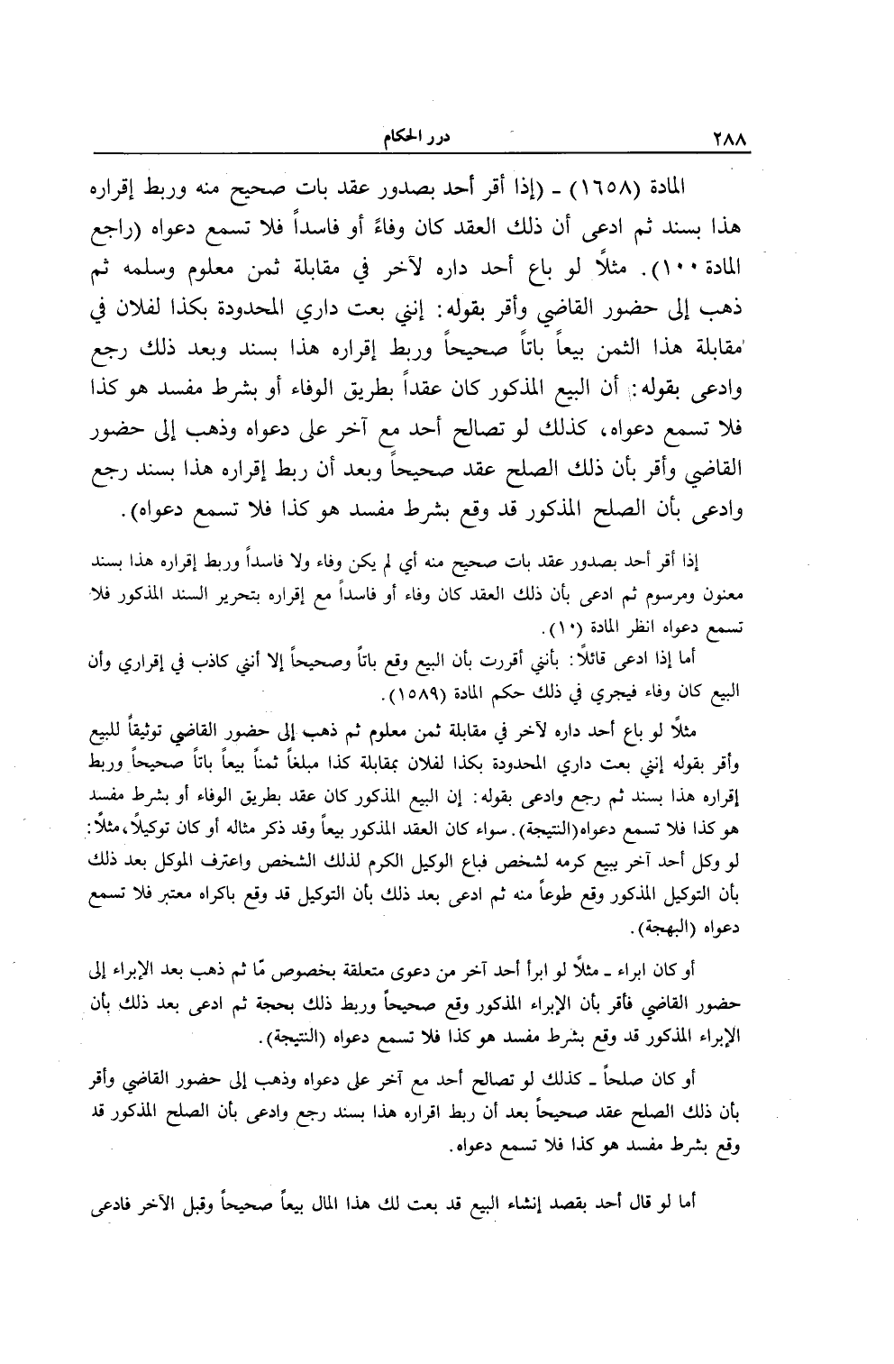 الْمَادَّةُ (1658) - (إذَا أَقَرَّ أَحَدٌ بِصُدُورِ عَقْدٍ بَاتٍّ صَحِيحٍ مِنْهُ وَرَبَطَ إقْرَارَهُ هَذَا بِسَنَدٍ ثُمَّ ادَّعَى أَنَّ ذَلِكَ الْعَقْدَ كَانَ وَفَاءً أَوْ فَاسِدًا فَلَا تُسْمَعُ دَعْوَاهُ (رَاجِعْ الْمَادَّةَ 100) . مَثَلًا لَوْ بَاعَ أَحَدٌ دَارِهِ لِآخَرَ فِي مُقَابَلَةِ ثَمَنٍ مَعْلُومٍ وَسَلَّمَهُ ثُمَّ ذَهَبَ إلَى حُضُورِ الْقَاضِي وَأَقَرَّ بِقَوْلِهِ: إنَّنِي بِعْت دَارِي الْمَحْدُودَةَ بِكَذَا لِفُلَانٍ فِي مُقَابَلَةِ هَذَا الثَّمَنِ بَيْعًا بَاتًّا صَحِيحًا وَرَبَطَ إقْرَارَهُ هَذَا بِسَنَدٍ وَبَعْدَ ذَلِكَ رَجَعَ وَادَّعَى بِقَوْلِهِ: إنَّ الْبَيْعَ الْمَذْكُورَ كَانَ عَقْدًا بِطَرِيقِ الْوَفَاءِ أَوْ بِشَرْطٍ مُفْسِدٍ هُوَ كَذَا فَلَا تُسْمَعُ دَعْوَاهُ، كَذَلِكَ لَوْ تَصَالَحَ أَحَدٌ مَعَ آخَرَ عَلَى دَعْوَاهُ وَذَهَبَ إلَى حُضُورِ الْقَاضِي وَأَقَرَّ بِأَنَّ ذَلِكَ الصُّلْحَ عُقِدَ صَحِيحًا وَبَعْدَ أَنْ رَبَطَ إقْرَارَهُ هَذَا بِسَنَدٍ رَجَعَ وَادَّعَى بِأَنَّ الصُّلْحَ الْمَذْكُورَ قَدْ وَقَعَ بِشَرْطٍ مُفْسِدٍ هُوَ كَذَا فَلَا تُسْمَعُ دَعْوَاهُ) .