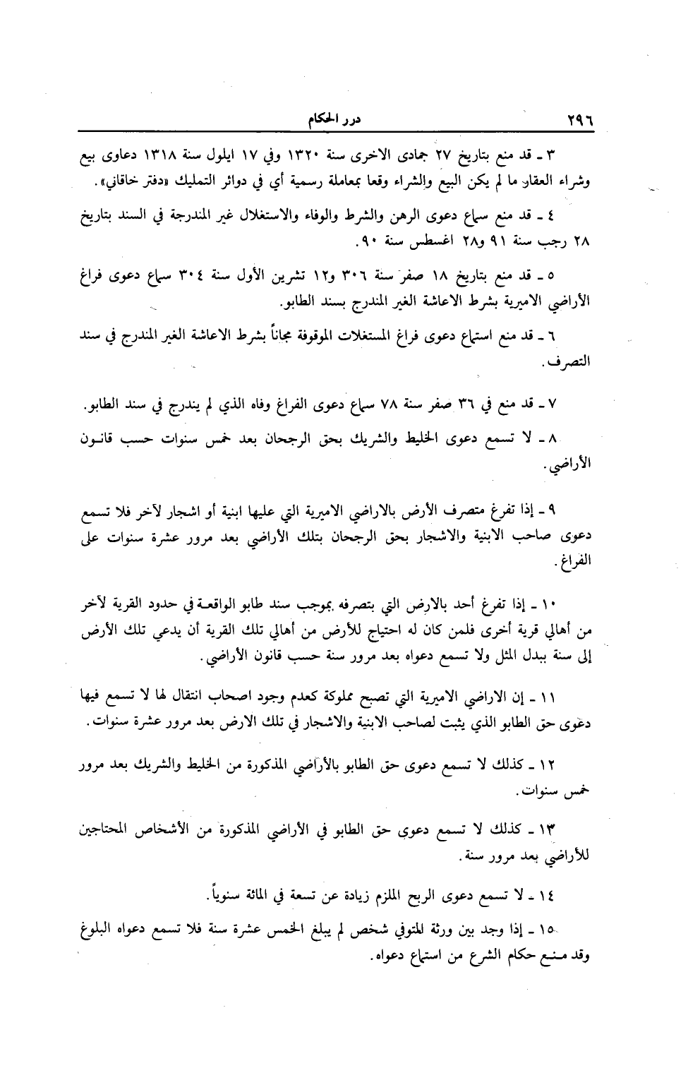 9 - إذَا تَفَرَّغَ مُتَصَرِّفُ الْأَرْضِ بِالْأَرَاضِيِ الْأَمِيرِيَّةِ الَّتِي عَلَيْهَا أَبْنِيَةٌ أَوْ أَشْجَارٌ لِآخَرَ فَلَا تُسْمَعُ دَعْوَى صَاحِبِ الْأَبْنِيَةِ وَالْأَشْجَارِ بِحَقِّ الرُّجْحَانِ بِتِلْكَ الْأَرَاضِي بَعْدَ مُرُورِ عَشْرِ سَنَوَاتٍ عَلَى الْفَرَاغِ. - إذَا تَفَرَّغَ أَحَدٌ بِالْأَرْضِ الَّتِي بِتَصَرُّفِهِ. بِمُوجِبِ سَنَد طَابُو الْوَاقِعَةِ فِي حُدُودِ الْقَرْيَةِ لِآخَرَ مِنْ أَهَالِي قَرْيَةٍ أُخْرَى فَلِمَنْ كَانَ لَهُ احْتِيَاجٌ لِلْأَرْضِ مِنْ أَهَالِي تِلْكَ الْقَرْيَةِ أَنْ يَدَّعِيَ تِلْكَ الْأَرْضَ إلَى سَنَةٍ بِبَدَلِ الْمِثْلِ وَلَا تُسْمَعُ دَعْوَاهُ بَعْدَ مُرُورِ سَنَةٍ حَسَبَ قَانُونِ الْأَرَاضِي. - إنَّ الْأَرَاضِيَ الْأَمِيرِيَّةَ الَّتِي تُصْبِحُ مَمْلُوكَةً كَعَدَمِ وُجُودِ أَصْحَابِ انْتِقَالٍ لَهَا لَا تُسْمَعُ فِيهَا دَعْوَى حَقِّ الطَّابُو الَّذِي يُثْبِتُ لِصَاحِبِ الْأَبْنِيَةِ وَالْأَشْجَارِ فِي تِلْكَ الْأَرْضِ بَعْدَ مُرُورِ عَشْرِ سَنَوَاتٍ. - كَذَلِكَ لَا تُسْمَعُ دَعْوَى حَقِّ الطَّابُو بِالْأَرَاضِيِ الْمَذْكُورَةِ مِنْ الْخَلِيطِ وَالشَّرِيكِ بَعْدَ مُرُورِ خَمْسِ سَنَوَاتٍ.