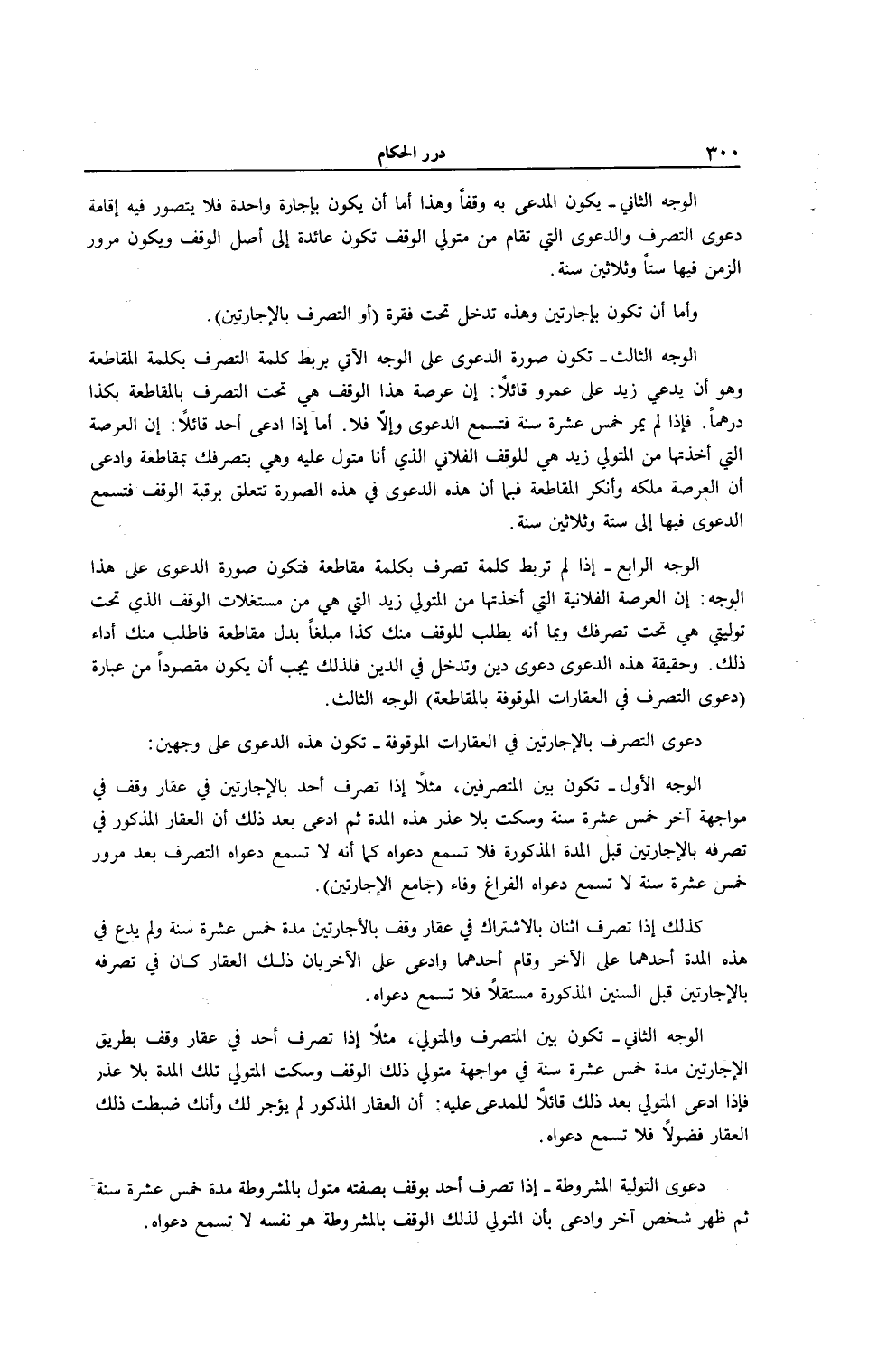 الْوَجْهُ الثَّانِي - يَكُونُ الْمُدَّعَى بِهِ وَقْفًا وَهَذَا أَمَّا أَنْ يَكُونَ بِإِجَارَةٍ وَاحِدَةٍ فَلَا يُتَصَوَّرُ فِيهِ إقَامَةُ دَعْوَى التَّصَرُّفِ وَالدَّعْوَى الَّتِي تُقَامُ مِنْ مُتَوَلِّي الْوَقْفِ تَكُونُ عَائِدَةً إلَى أَصْلِ الْوَقْفِ وَيَكُونُ مُرُورُ الزَّمَنِ فِيهَا سِتًّا وَثَلَاثِينَ سَنَةً. وَأَمَّا أَنْ تَكُونَ بِإِجَارَتَيْنِ وَهَذِهِ تَدْخُلُ تَحْتَ فِقْرَةِ (أَوْ التَّصَرُّفُ بِالْإِجَارَتَيْنِ) .