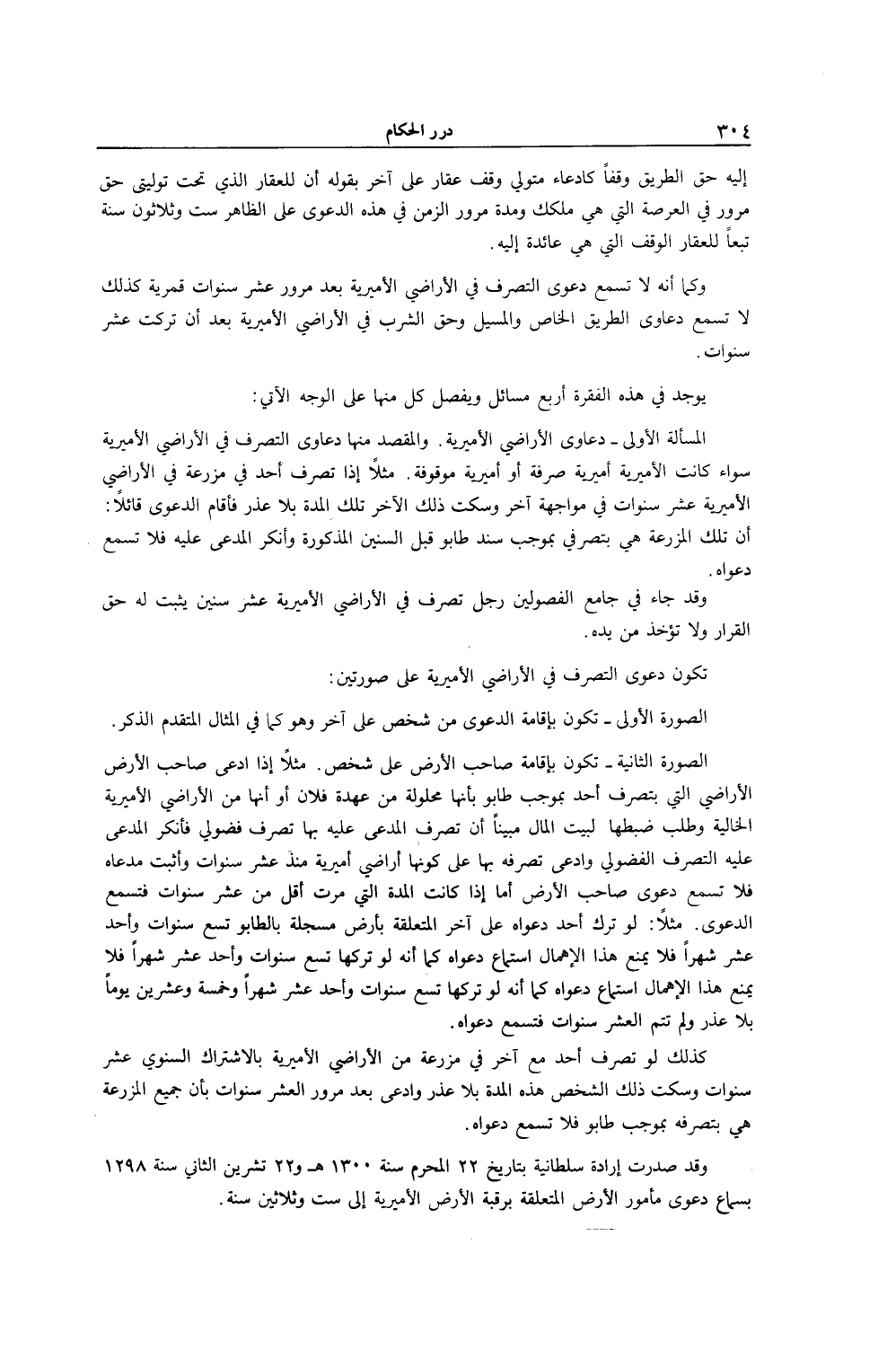 يُوجَدُ فِي هَذِهِ الْفِقْرَةِ أَرْبَعُ مَسَائِلَ وَيُفَصَّلُ كُلٌّ مِنْهَا عَلَى الْوَجْهِ الْآتِي: الْمَسْأَلَةُ الْأُولَى - دَعَاوَى الْأَرَاضِيِ الْأَمِيرِيَّةِ وَالْمَقْصِدُ مِنْهَا دَعَاوَى التَّصَرُّفِ فِي الْأَرَاضِي الْأَمِيرِيَّةِ سَوَاءٌ كَانَتْ الْأَمِيرِيَّةُ أَمِيرِيَّةً صِرْفَةً أَوْ أَمِيرِيَّةً مَوْقُوفَةً. مَثَلًا إذَا تَصَرَّفَ أَحَدٌ فِي مَزْرَعَةٍ فِي الْأَرَاضِي الْأَمِيرِيَّةِ عَشْرَ سَنَوَاتٍ فِي مُوَاجَهَةِ آخَرَ وَسَكَتَ ذَلِكَ الْآخَرُ تِلْكَ الْمُدَّةَ بِلَا عُذْرٍ فَأَقَامَ الدَّعْوَى قَائِلًا: إنَّ تِلْكَ الْمَزْرَعَةَ هِيَ بِتَصَرُّفِي بِمُوجَبِ سَنَدٍ طَابُو قَبْلَ السِّنِينَ الْمَذْكُورَةِ وَأَنْكَرَ الْمُدَّعَى عَلَيْهِ فَلَا تُسْمَعُ دَعْوَاهُ.