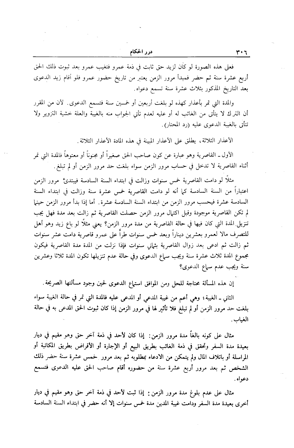 فَعَلَى هَذِهِ الصُّورَةِ لَوْ كَانَ لِزَيْدٍ حَقٌّ ثَابِتٌ فِي ذِمَّةِ عَمْرٍو فَتَغَيَّبَ عَمْرٌو بَعْدَ ثُبُوتِ ذَلِكَ الْحَقِّ أَرْبَعَ عَشْرَةَ سَنَةً ثُمَّ حَضَرَ فَمَبْدَأُ مُرُورِ الزَّمَنِ يُعْتَبَرُ مِنْ تَارِيخِ حُضُورِ عَمْرٍو فَلَوْ أَقَامَ زَيْدٌ الدَّعْوَى بَعْدَ التَّارِيخِ الْمَذْكُورِ بِثَلَاثَ عَشْرَةَ سَنَةً تُسْمَعُ دَعْوَاهُ وَالْمُدَّةُ الَّتِي تَمُرُّ بِأَعْذَارٍ كَهَذِهِ لَوْ بَلَغَتْ أَرْبَعِينَ أَوْ خَمْسِينَ سَنَةً فَتُسْمَعُ الدَّعْوَى؛ لِأَنَّ مِنْ الْمُقَرَّرِ أَنَّ التَّرْكَ لَا يَتَأَتَّى مِنْ الْغَائِبِ لَهُ أَوْ عَلَيْهِ لِعَدَمِ تَأَتِّي الْجَوَابِ مِنْهُ بِالْغَيْبَةِ وَالْعِلَّةُ خَشْيَةُ التَّزْوِيرِ وَلَا تَتَأَتَّى بِالْغَيْبَةِ الدَّعْوَى عَلَيْهِ (رَدُّ الْمُحْتَارِ) .