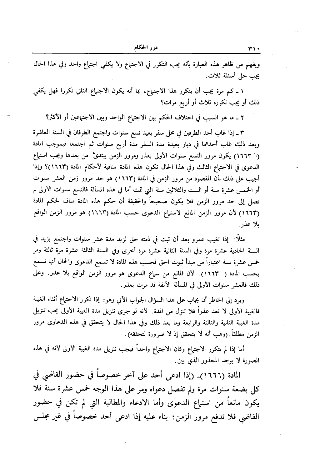 وَيَرِدُ إلَى الْخَاطِرِ أَنْ يُجَابَ عَلَى هَذَا السُّؤَالِ الْجَوَابُ الْآتِي وَهُوَ: إذَا تَكَرَّرَ الِاجْتِمَاعُ أَثْنَاءَ الْغَيْبَةِ فَالْغَيْبَةُ الْأُولَى لَا تُعَدُّ عُذْرًا فَلَا تُنَزَّلُ مِنْ الْمُدَّةِ؛ لِأَنَّهُ لَوْ جَرَى تَنْزِيلُ مُدَّةِ الْغَيْبَةِ الْأُولَى يَجِبُ تَنْزِيلُ مُدَّةِ الْغَيْبَةِ الثَّانِيَةِ وَالثَّالِثَةِ وَالرَّابِعَةِ وَمَا بَعْدَ ذَلِكَ وَفِي هَذَا الْحَالِ لَا يَتَحَقَّقُ فِي هَذِهِ الدَّعَاوَى مُرُورُ الزَّمَنِ مُطْلَقًا (وَهَبْ أَنَّهُ لَا يَتَحَقَّقُ إذْ لَا ضَرُورَةَ لِتَحَقُّقِهِ) .