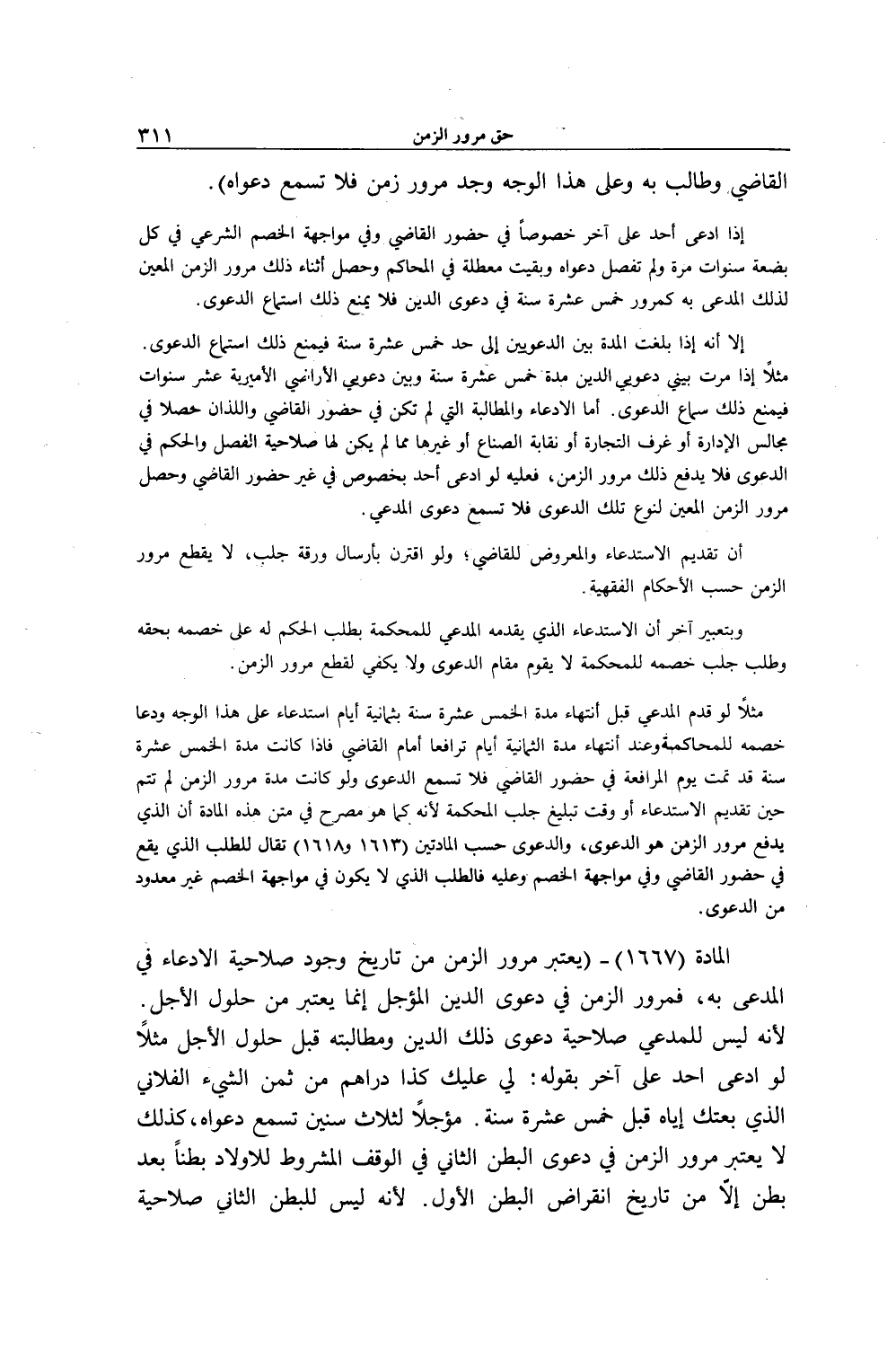 الْمَادَّةُ (1667) - (يُعْتَبَرُ مُرُورُ الزَّمَنِ مِنْ تَارِيخِ وُجُودِ صَلَاحِيَةِ الِادِّعَاءِ فِي الْمُدَّعَى بِهِ، فَمُرُورُ الزَّمَنِ فِي دَعْوَى الدَّيْنِ الْمُؤَجَّلِ إنَّمَا يُعْتَبَرُ مِنْ حُلُولِ الْأَجَلِ؛ لِأَنَّهُ لَيْسَ لِلْمُدَّعِي صَلَاحِيَةُ دَعْوَى ذَلِكَ الدَّيْنِ وَمُطَالَبَتُهُ قَبْلَ حُلُولِ الْأَجَلِ. مَثَلًا لَوْ ادَّعَى أَحَدٌ عَلَى آخَرَ بِقَوْلِهِ: لِي عَلَيْك كَذَا دَرَاهِمَ مِنْ ثَمَنِ الشَّيْءِ الْفُلَانِيِّ الَّذِي بِعْتُكَ إيَّاهُ قَبْلَ خَمْسَ عَشْرَةَ سَنَةً مُؤَجَّلًا لِثَلَاثِ سِنِينَ تُسْمَعُ دَعْوَاهُ، كَذَلِكَ لَا يُعْتَبَرُ مُرُورُ الزَّمَنِ فِي دَعْوَى الْبَطْنِ الثَّانِي فِي الْوَقْفِ الْمَشْرُوطِ لِلْأَوْلَادِ بَطْنًا بَعْدَ بَطْنٍ إلَّا مِنْ تَارِيخِ انْقِرَاضِ الْبَطْنِ الْأَوَّلِ؛ لِأَنَّهُ لَيْسَ لِلْبَطْنِ الثَّانِي صَلَاحِيَةُ