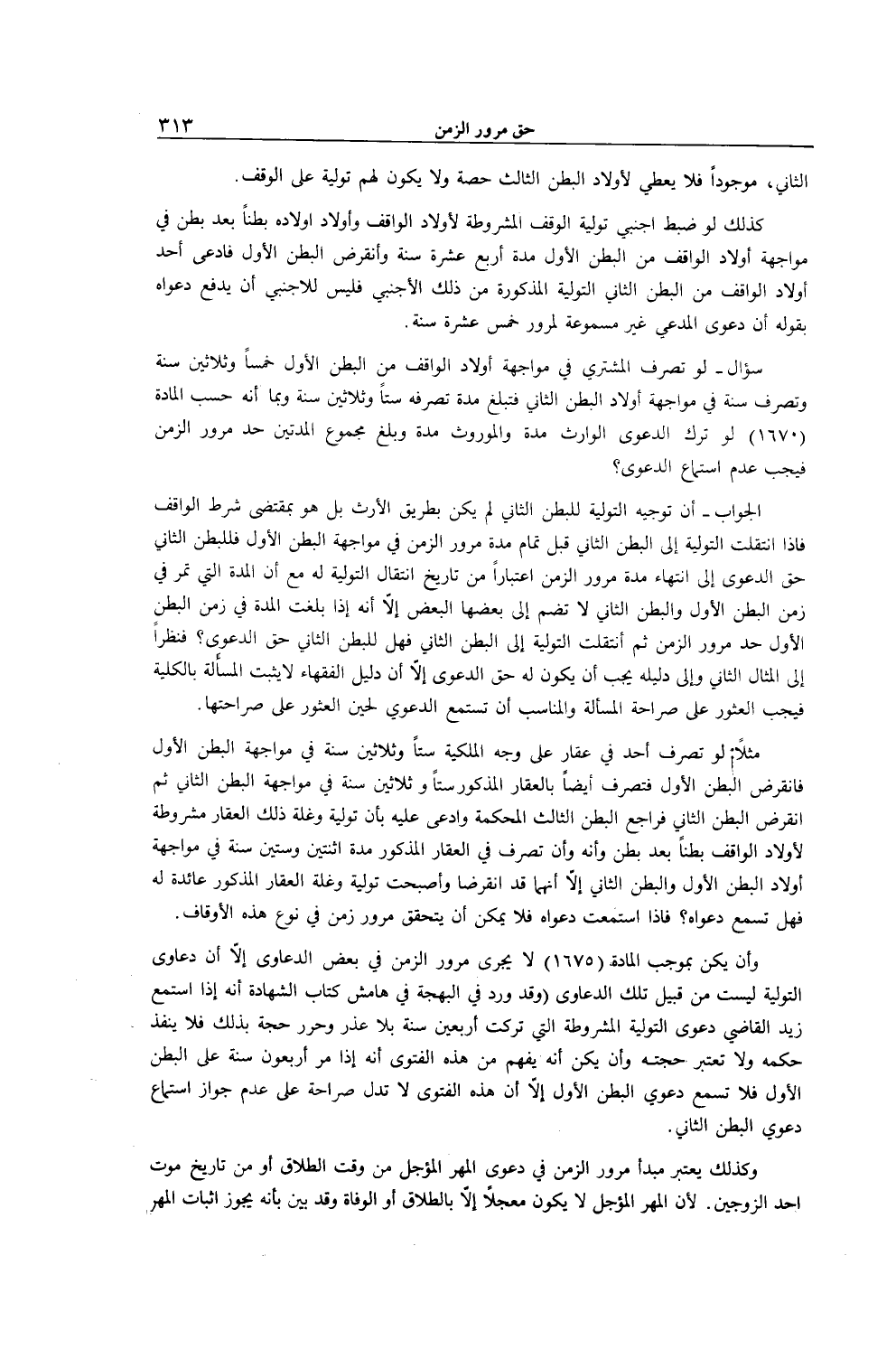 سُؤَالٌ - لَوْ تَصَرَّفَ الْمُشْتَرِي فِي مُوَاجَهَةِ أَوْلَادِ الْوَاقِفِ مِنْ الْبَطْنِ الْأَوَّلِ خَمْسًا وَثَلَاثِينَ سَنَةً وَتَصَرَّفَ سَنَةً فِي مُوَاجَهَةِ أَوْلَادِ الْبَطْنِ الثَّانِي فَتَبْلُغُ مُدَّةُ تَصَرُّفِهِ سِتًّا وَثَلَاثِينَ سَنَةً وَبِمَا أَنَّهُ حَسَبَ الْمَادَّةِ (167) لَوْ تَرَكَ الدَّعْوَى الْوَارِثُ مُدَّةً وَالْمَوْرُوثُ مُدَّةً وَبَلَغَ مَجْمُوعُ الْمُدَّتَيْنِ حَدَّ مُرُورِ الزَّمَنِ فَيَجِبُ عَدَمُ اسْتِمَاعِ الدَّعْوَى؟ الْجَوَابُ - إنَّ تَوْجِيهَ التَّوْلِيَةِ لِلْبَطْنِ الثَّانِي لَمْ يَكُنْ بِطَرِيقِ الْإِرْثِ بَلْ هُوَ بِمُقْتَضَى شَرْطِ الْوَاقِفِ فَإِذَا انْتَقَلَتْ التَّوْلِيَةُ إلَى الْبَطْنِ الثَّانِي قَبْلَ تَمَامِ مُدَّةِ مُرُورِ الزَّمَنِ فِي مُوَاجَهَةِ الْبَطْنِ الْأَوَّلِ فَلِلْبَطْنِ الثَّانِي حَقُّ الدَّعْوَى إلَى انْتِهَاءِ مُدَّةِ مُرُورِ الزَّمَنِ اعْتِبَارًا مِنْ تَارِيخِ انْتِقَالِ التَّوْلِيَةِ لَهُ مَعَ أَنَّ الْمُدَّةَ الَّتِي تَمُرُّ فِي زَمَنِ الْبَطْنِ الْأَوَّلِ وَالْبَطْنِ الثَّانِي لَا تُضَمُّ إلَى بَعْضِهَا الْبَعْضِ إلَّا أَنَّهُ إذَا بَلَغَتْ الْمُدَّةُ فِي زَمَنِ الْبَطْنِ الْأَوَّلِ حَدَّ مُرُورِ الزَّمَنِ ثُمَّ انْتَقَلَتْ التَّوْلِيَةُ إلَى الْبَطْنِ الثَّانِي فَهَلْ لِلْبَطْنِ الثَّانِي حَقُّ الدَّعْوَى؟ فَنَظَرًا إلَى الْمِثَالِ الثَّانِي وَالَى دَلِيلِهِ يَجِبُ أَنْ يَكُونَ لَهُ حَقُّ الدَّعْوَى إلَّا أَنَّ دَلِيلَ الْفُقَهَاءِ لَا يُثْبِتُ الْمَسْأَلَةَ بِالْكُلِّيَّةِ فَيَجِبُ الْعُثُورُ عَلَى صَرَاحَةِ الْمَسْأَلَةِ وَالْمُنَاسِبُ أَنْ تُسْتَمَعَ الدَّعْوَى لِحِينِ الْعُثُورِ عَلَى صَرَاحَتِهَا.