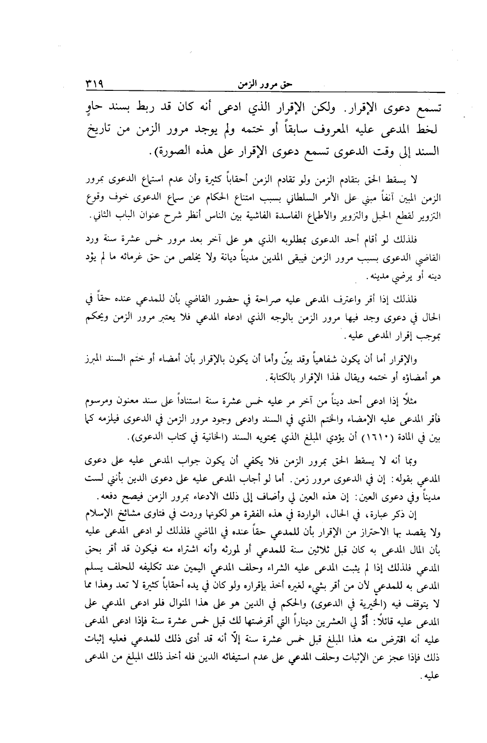لَا يَسْقُطُ الْحَقُّ بِتَقَادُمِ الزَّمَنِ وَلَوْ تَقَادَمَ الزَّمَنُ أَحْقَابًا كَثِيرَةً، وَأَنَّ عَدَمَ اسْتِمَاعِ الدَّعْوَى بِمُرُورِ الزَّمَنِ الْمُبَيِّنِ آنِفًا مَبْنِيٌّ عَلَى الْأَمْرِ السُّلْطَانِيِّ بِسَبَبِ امْتِنَاعِ الْحُكَّامِ عَنْ سَمَاعِ الدَّعْوَى خَوْفَ وُقُوعِ التَّزْوِيرِ لِقَطْعِ الْحِيَلِ وَالتَّزْوِيرِ وَالْأَطْمَاعِ الْفَاسِدَةِ الْفَاشِيَةِ بَيْنَ النَّاسِ اُنْظُرْ شَرْحَ عِنْوَانِ الْبَابِ الثَّانِي.