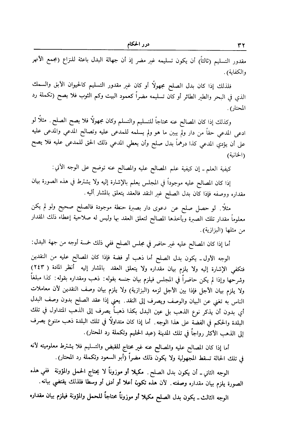 مَثَلًا لَوْ ادَّعَى الْمُدَّعِي حَقًّا مِنْ دَارٍ وَلَمْ يُبَيِّنْ مَا هُوَ، وَلَمْ يُسَلِّمْهُ لِلْمُدَّعَى عَلَيْهِ، وَتَصَالَحَ الْمُدَّعِي وَالْمُدَّعَى عَلَيْهِ عَلَى أَنْ يُؤَدِّيَ الْمُدَّعِي كَذَا دِرْهَمًا بَدَلَ صُلْحٍ، وَأَنْ يُعْطِيَ الْمُدَّعِي ذَلِكَ الْحَقَّ لِلْمُدَّعَى عَلَيْهِ فَلَا يَصِحُّ (الْخَانِيَّةُ) كَيْفِيَّةُ الْعِلْمِ - إنَّ كَيْفِيَّةَ عِلْمِ الْمُصَالَحِ عَلَيْهِ وَالْمُصَالَحِ عَنْهُ تُوَضَّحُ عَلَى الْوَجْهِ الْآتِي: إذَا كَانَ الْمُصَالَحُ عَلَيْهِ مَوْجُودًا فِي الْمَجْلِسِ يُعْلَمُ بِالْإِشَارَةِ إلَيْهِ، وَلَا يُشْتَرَطُ فِي هَذِهِ الصُّورَةِ بَيَانُ مِقْدَارِهِ وَوَصْفِهِ، فَإِذَا كَانَ بَدَلُ الصُّلْحِ غَيْرَ النَّقْدِ فَالْعَقْدُ يَتَعَلَّقُ بِالْمُشَارِ إلَيْهِ مَثَلًا: لَوْ حَصَلَ صُلْحٌ عَنْ دَعْوَى دَارٍ بِصُبْرَةِ حِنْطَةٍ مَوْجُودَةٍ فَالصُّلْحُ صَحِيحٌ وَلَوْ لَمْ يَكُنْ مَعْلُومًا مِقْدَارُ تِلْكَ الصُّبْرَةِ، وَيَأْخُذُهَا الْمُصَالِحُ لِتَعَلُّقِ الْعَقْدِ بِهَا، وَلَيْسَ لَهُ صَلَاحِيَّةُ إعْطَاءِ ذَلِكَ الْمِقْدَارِ مِنْ مِثْلِهَا (الْبَزَّازِيَّةُ) .