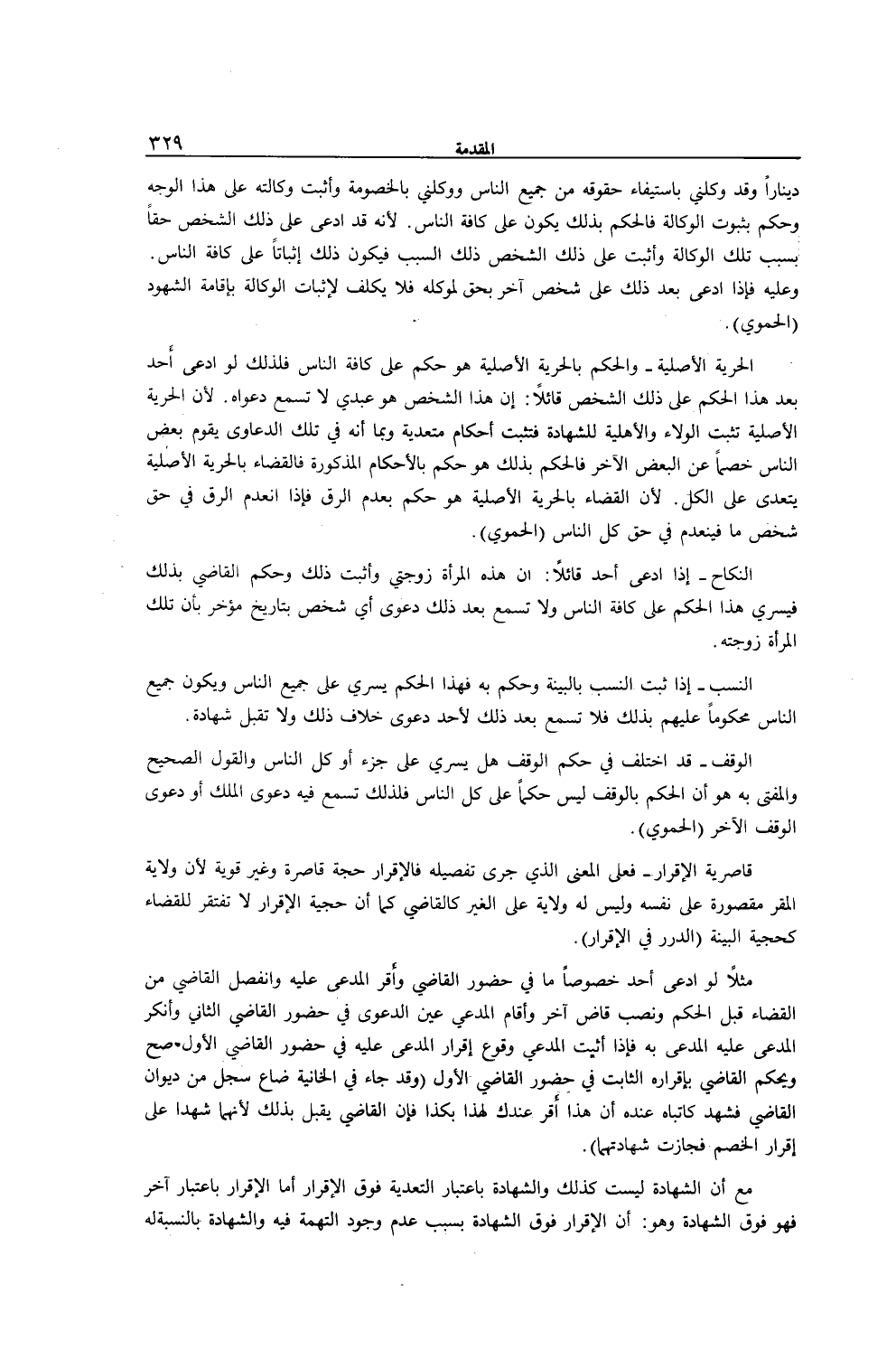 دِينَارًا وَقَدْ وَكَّلَنِي بِاسْتِيفَاءِ حُقُوقِهِ مِنْ جَمِيعِ النَّاسِ وَوَكَّلَنِي بِالْخُصُومَةِ وَأَثْبَتَ وَكَالَتَهُ عَلَى هَذَا الْوَجْهِ وَحُكِمَ بِثُبُوتِ الْوَكَالَةِ فَالْحُكْمُ بِذَلِكَ يَكُونُ عَلَى كَافَّةِ النَّاسِ؛ لِأَنَّهُ قَدْ ادَّعَى عَلَى ذَلِكَ الشَّخْصِ حَقًّا بِسَبَبِ تِلْكَ الْوَكَالَةِ وَأَثْبَتَ عَلَى ذَلِكَ الشَّخْصِ ذَلِكَ السَّبَبَ فَيَكُونُ ذَلِكَ إثْبَاتًا عَلَى كَافَّةِ النَّاسِ. وَعَلَيْهِ فَإِذَا ادَّعَى بَعْدَ ذَلِكَ عَلَى شَخْصٍ آخَرَ بِحَقٍّ لِمُوَكَّلِهِ فَلَا يُكَلَّفُ لِإِثْبَاتِ الْوَكَالَةِ بِإِقَامَةِ الشُّهُودِ (الْحَمَوِيُّ) .