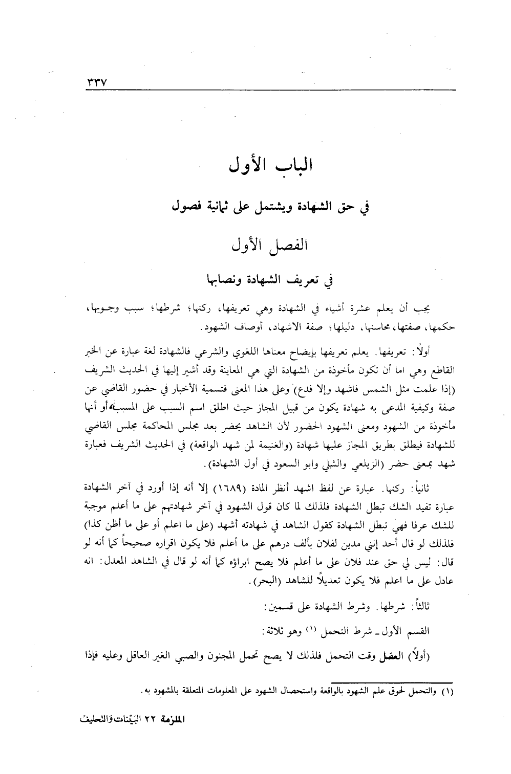[الْبَابُ الْأَوَّلُ فِي حَقِّ الشَّهَادَةِ وَيَشْتَمِلُ عَلَى ثَمَانِيَةِ فُصُولٍ] [الْفَصْلُ الْأَوَّلُ فِي تَعْرِيفِ الشَّهَادَةِ وَنصابهَا]