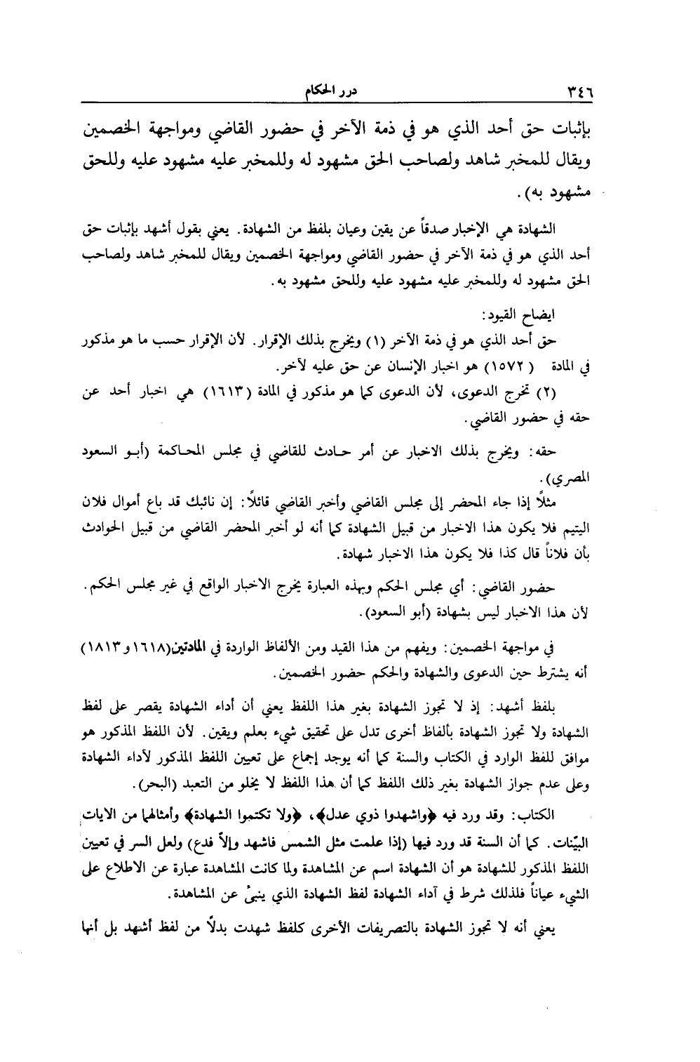 فِي مُوَاجَهَةِ الْخَصْمَيْنِ: وَيُفْهَمُ مِنْ هَذَا الْقَيْدِ وَمَنْ الْأَلْفَاظِ الْوَارِدَةِ فِي الْمَادَّتَيْنِ (1618 و 1813) أَنَّهُ يُشْتَرَطُ حِينَ الدَّعْوَى وَالشَّهَادَةِ وَالْحُكْمِ حُضُورُ الْخَصْمَيْنِ.