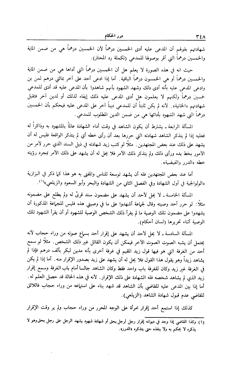الْمَسْأَلَةُ الرَّابِعَةُ - يُشْتَرَطُ أَنْ يَكُونَ الشَّاهِدُ فِي وَقْتِ أَدَاءِ الشَّهَادَةِ عَالِمًا بِالْمَشْهُودِ بِهِ وَذَاكِرًا لَهُ فَعَلَيْهِ إذَا لَمْ يَتَذَكَّرْ الشَّاهِدُ شَهَادَتَهُ الَّتِي حَرَّرَهَا بَعْدَ أَنْ رَأَى خَطَّهُ أَيْ لَمْ يَتَذَكَّرْ الْوَاقِعَةَ فَلَيْسَ لَهُ أَنْ يَشْهَدَ عَلَى ذَلِكَ عِنْدَ بَعْضِ الْمُجْتَهِدِينَ. مَثَلًا لَوْ كَتَبَ زَيْدٌ شَهَادَتَهُ فِي ذَيْلِ السَّنَدِ الَّذِي حُرِّرَ لِأَمْرٍ مِنْ الْأُمُورِ بِخَطِّ يَدِهِ وَرَأَى ذَلِكَ وَلَمْ يَتَذَكَّرْ ذَلِكَ الْأَمْرَ فَلَا يَحِلُّ لَهُ أَنْ يَشْهَدَ عَلَى ذَلِكَ الْأَمْرِ بِمُجَرَّدِ رُؤْيَتِهِ خَطَّهُ (الدُّرَرُ وَالْفَيْضِيَّةُ) أَمَّا عِنْدَ بَعْضِ الْمُجْتَهِدِينَ فَلَهُ أَنْ يَشْهَدَ تَوْسِعَةً لِلنَّاسِ وَالْمُفْتَى بِهِ هُوَ هَذَا كَمَا ذُكِرَ فِي الْبَزَّازِيَّةُ (الْوَلْوَالِجِيَّةِ فِي أَوَّلِ الشَّهَادَةِ وَفِي الْفَصْلِ الثَّانِي مِنْ الشَّهَادَةِ وَالْبَحْرُ وَأَبُو السُّعُودِ وَالزَّيْلَعِيّ) .