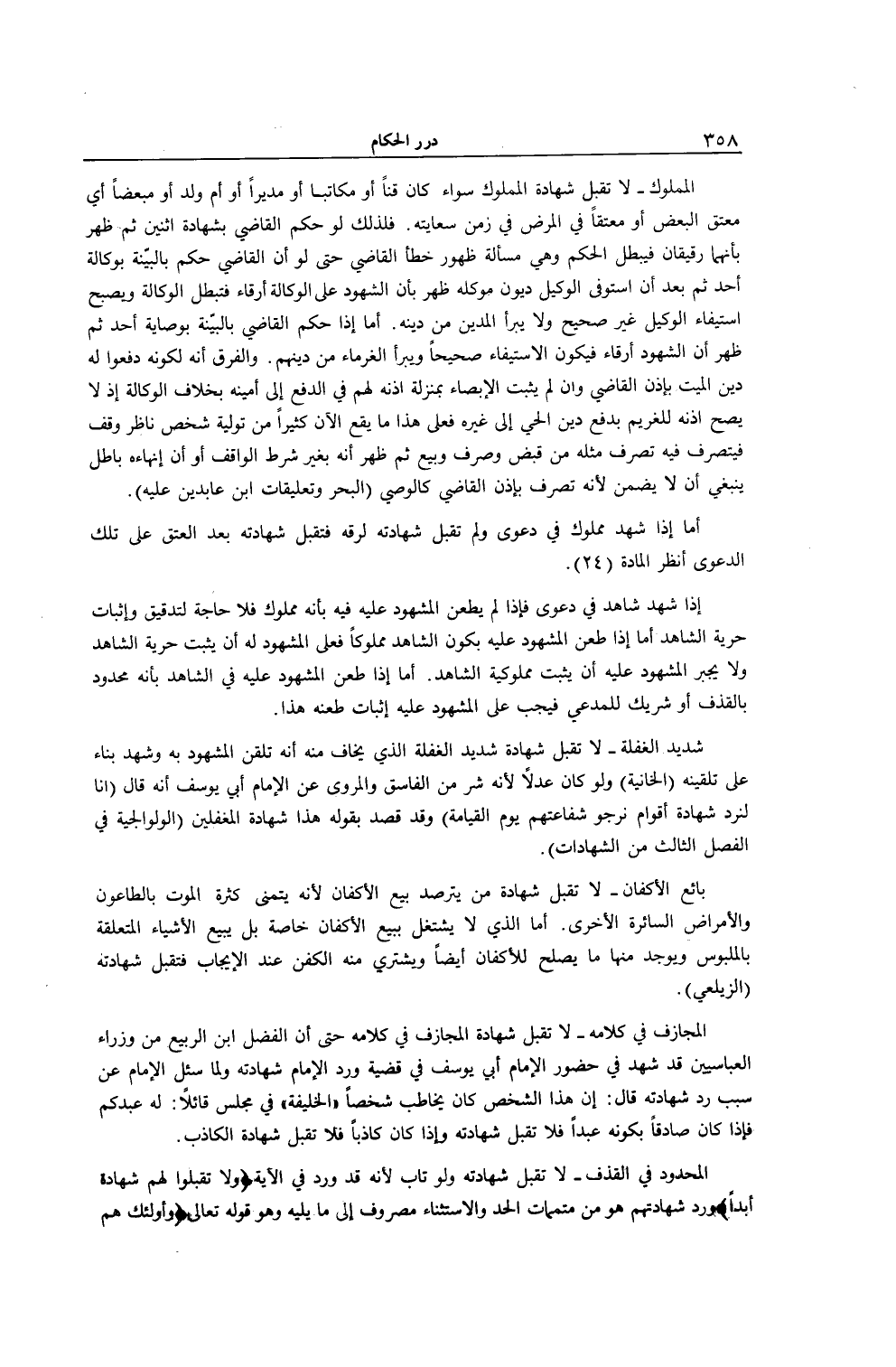 الْمَمْلُوكُ - لَا تُقْبَلُ شَهَادَةُ الْمَمْلُوكِ سَوَاءٌ كَانَ قِنًّا أَوْ مُكَاتَبًا أَوْ مُدَبَّرًا أَوْ أُمَّ وَلَدٍ أَوْ مُبَعَّضًا أَيْ مُعْتَقَ الْبَعْضِ أَوْ مُعْتَقًا فِي الْمَرَضِ فِي زَمَنِ سِعَايَتِهِ. فَلِذَلِكَ لَوْ حَكَمَ الْقَاضِي بِشَهَادَةِ اثْنَيْنِ ثُمَّ ظَهَرَ بِأَنَّهُمَا رَقِيقَانِ فَيَبْطُلُ الْحُكْمُ وَهِيَ مَسْأَلَةُ ظُهُورِ خَطَأِ الْقَاضِي حَتَّى لَوْ أَنَّ الْقَاضِيَ حَكَمَ بِالْبَيِّنَةِ بِوَكَالَةِ أَحَدٍ ثُمَّ بَعْدَ أَنْ اسْتَوْفَى الْوَكِيلُ دُيُونَ مُوَكِّلِهِ ظَهَرَ بِأَنَّ الشُّهُودَ عَلَى الْوَكَالَةِ أَرِقَّاءُ فَتَبْطُلُ الْوَكَالَةُ وَيُصْبِحُ اسْتِيفَاءُ الْوَكِيلِ غَيْرَ صَحِيحٍ وَلَا يَبْرَأُ الْمَدِينُ مِنْ دَيْنِهِ. أَمَّا إذَا حَكَمَ الْقَاضِي بِالْبَيِّنَةِ بِوِصَايَةِ أَحَدٍ ثُمَّ ظَهَرَ أَنَّ الشُّهُودَ أَرِقَّاءُ فَيَكُونُ الِاسْتِيفَاءُ صَحِيحًا وَيَبْرَأُ الْغُرَمَاءُ مِنْ دَيْنِهِمْ وَالْفَرْقُ أَنَّهُ لِكَوْنِهِ دَفَعُوا لَهُ دَيْنَ الْمَيِّتِ بِإِذْنِ الْقَاضِي وَإِنْ لَمْ يَثْبُتْ الْإِيصَاءُ بِمَنْزِلَةِ إذْنِهِ لَهُمْ فِي الدَّفْعِ إلَى أَمِينِهِ بِخِلَافِ الْوَكَالَةِ إذْ لَا يَصِحُّ إذْنُهُ لِلْغَرِيمِ بِدَفْعِ دَيْنِ الْحَيِّ إلَى غَيْرِهِ فَعَلَى هَذَا مَا يَقَعُ الْآنَ كَثِيرًا مِنْ تَوْلِيَةِ شَخْصٍ نَاظِرَ وَقْفٍ فَيَتَصَرَّفُ فِيهِ تَصَرُّفَ مِثْلِهِ مِنْ قَبْضٍ وَصَرْفٍ وَبَيْعٍ ثُمَّ ظَهَرَ أَنَّهُ بِغَيْرِ شَرْطِ الْوَاقِفِ أَوْ أَنَّ إنْهَاءَهُ بَاطِلٌ يَنْبَغِي أَنْ لَا يَضْمَنَ؛ لِأَنَّهُ تَصَرَّفَ بِإِذْنِ الْقَاضِي كَالْوَصِيِّ (الْبَحْرُ وَتَعْلِيقَاتُ ابْنِ عَابِدِينَ عَلَيْهِ) .