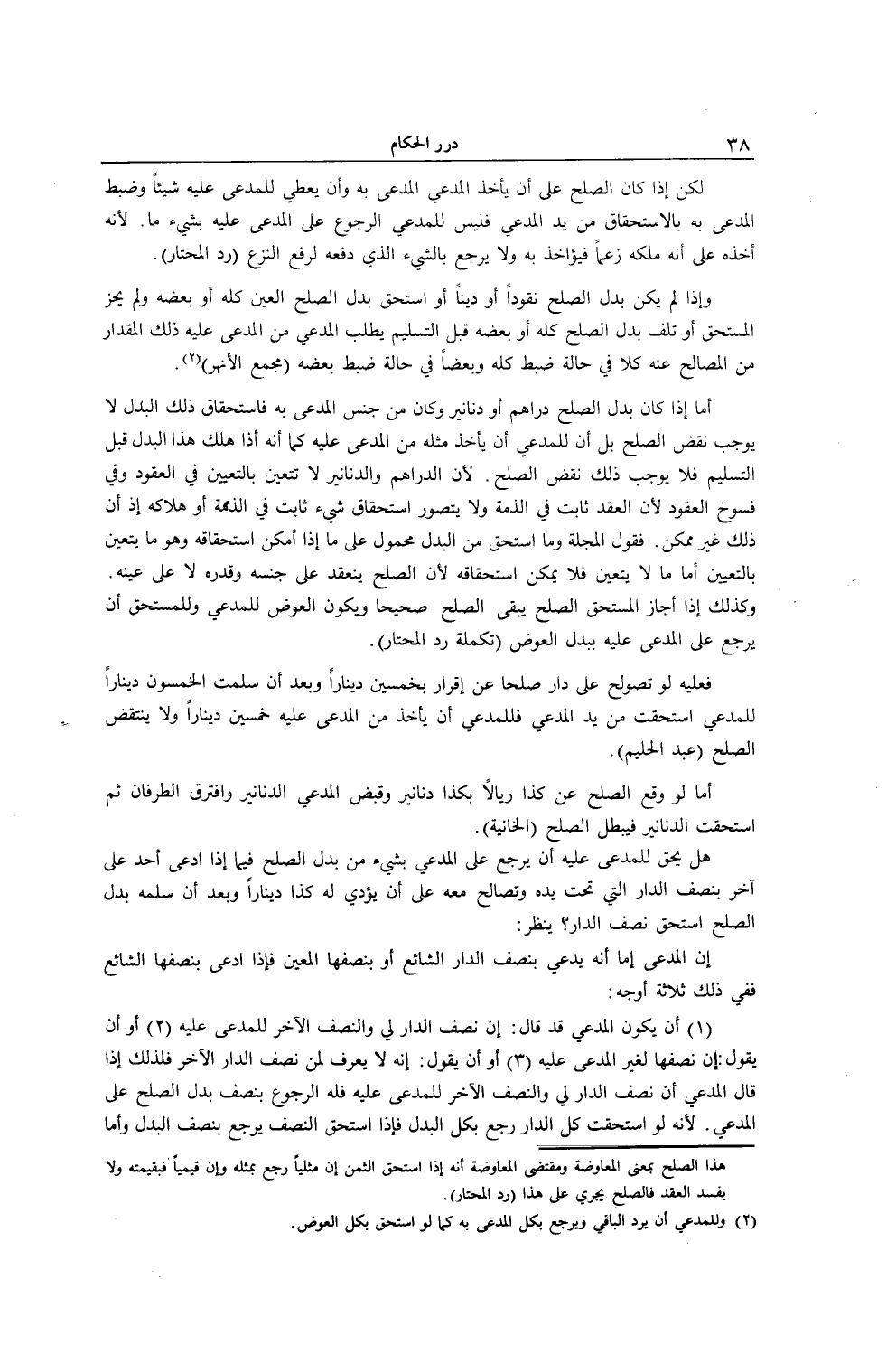 هَلْ يَحِقُّ لِلْمُدَّعَى عَلَيْهِ أَنْ يَرْجِعَ عَلَى الْمُدَّعِي بِشَيْءٍ مِنْ بَدَلِ الصُّلْحِ فِيمَا إذَا ادَّعَى أَحَدٌ عَلَى آخَرَ بِنِصْفِ الدَّارِ الَّتِي تَحْتَ يَدِهِ، وَتَصَالَحَ مَعَهُ عَلَى أَنْ يُؤَدِّيَ لَهُ كَذَا دِينَارًا وَبَعْدَ أَنْ سَلَّمَهُ بَدَلَ الصُّلْحِ اُسْتُحِقَّ نِصْفُ الدَّارِ؟ يُنْظَرُ: إنَّ الْمُدَّعِي إمَّا أَنَّهُ يَدَّعِي بِنِصْفِ الدَّارِ الشَّائِعِ، أَوْ بِنِصْفِهَا الْمُعَيَّنِ فَإِذَا ادَّعَى بِنِصْفِهَا الشَّائِعِ فَفِي ذَلِكَ ثَلَاثَةُ أَوْجُهٍ: (1) - أَنْ يَكُونَ الْمُدَّعِي قَدْ قَالَ: إنَّ نِصْفَ الدَّارِ لِي، وَالنِّصْفُ الْآخَرُ لِلْمُدَّعَى عَلَيْهِ (2) - أَوْ أَنْ يَقُولَ: إنَّ نِصْفَهَا لِغَيْرِ الْمُدَّعَى عَلَيْهِ (3) ، أَوْ أَنْ يَقُولَ: إنَّهُ لَا يَعْرِفُ لِمَنْ نِصْفُ الدَّارِ الْآخَرُ؛ فَلِذَلِكَ إذَا قَالَ الْمُدَّعِي: إنَّ نِصْفَ الدَّارِ لِي، وَالنِّصْفُ الْآخَرُ لِلْمُدَّعَى عَلَيْهِ فَلَهُ الرُّجُوعُ بِنِصْفِ بَدَلِ الصُّلْحِ عَلَى الْمُدَّعِي؛ لِأَنَّهُ لَوْ أَسْتُحِقَّتْ كُلُّ الدَّارِ رَجَعَ بِكُلِّ الْبَدَلِ، فَإِذَا اُسْتُحِقَّ النِّصْفُ يَرْجِعُ بِنِصْفِ الْبَدَلِ وَأَمَّا