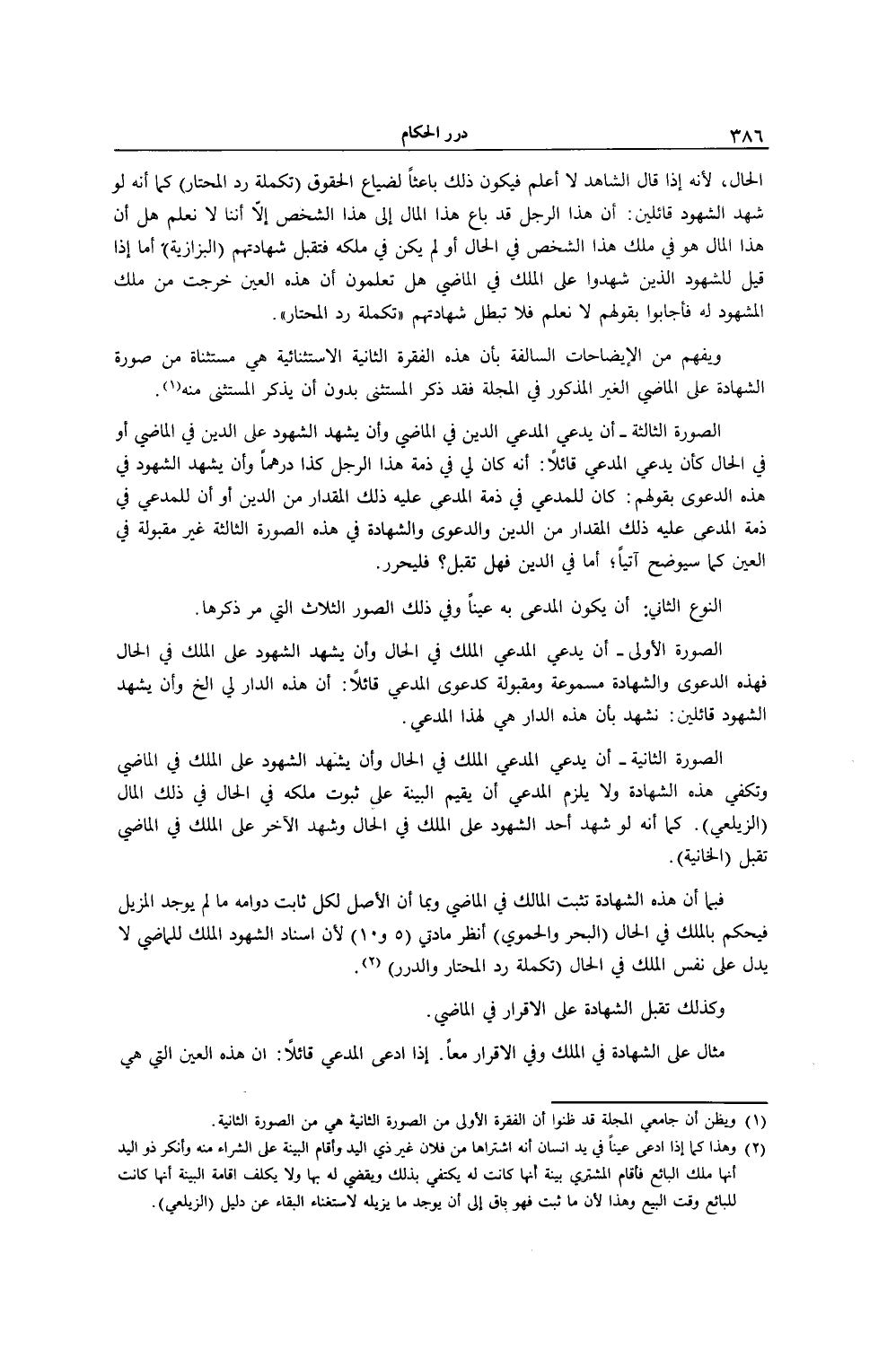 الْحَالِ؛ لِأَنَّهُ إذَا قَالَ الشَّاهِدُ: لَا أَعْلَمُ فَيَكُونُ ذَلِكَ بَاعِثًا لِضَيَاعِ الْحُقُوقِ (تَكْمِلَةُ رَدِّ الْمُحْتَارِ) كَمَا أَنَّهُ لَوْ شَهِدَ الشُّهُودُ قَائِلِينَ: إنَّ هَذَا الرَّجُلَ قَدْ بَاعَ هَذَا الْمَالَ إلَى هَذَا الشَّخْصِ إلَّا أَنَّنَا لَا نَعْلَمُ هَلْ أَنَّ هَذَا الْمَالَ هُوَ فِي مِلْكِ هَذَا الشَّخْصِ فِي الْحَالِ أَوْ لَمْ يَكُنْ فِي مِلْكِهِ فَتُقْبَلُ شَهَادَتُهُمْ (الْبَزَّازِيَّةُ) أَمَّا إذَا قِيلَ لِلشُّهُودِ الَّذِينَ شَهِدُوا عَلَى الْمِلْكِ فِي الْمَاضِي: هَلْ تَعْلَمُونَ أَنَّ هَذِهِ الْعَيْنَ خَرَجَتْ مِنْ مِلْكِ الْمَشْهُودِ لَهُ؟ فَأَجَابُوا بِقَوْلِهِمْ: لَا نَعْلَمُ فَلَا تَبْطُلُ شَهَادَتُهُمْ (تَكْمِلَةُ رَدِّ الْمُحْتَارِ) وَيُفْهَمُ مِنْ الْإِيضَاحَاتِ السَّالِفَةِ بِأَنَّ هَذِهِ الْفِقْرَةَ الثَّانِيَةَ الِاسْتِثْنَائِيَّة هِيَ مُسْتَثْنَاةٌ مِنْ صُورَةِ الشَّهَادَةِ عَلَى الْمَاضِي الْغَيْرِ الْمَذْكُورِ فِي الْمَجَلَّةِ فَقَدْ ذَكَرَ الْمُسْتَثْنَى بِدُونِ أَنْ يَذْكُرَ الْمُسْتَثْنَى مِنْهُ.