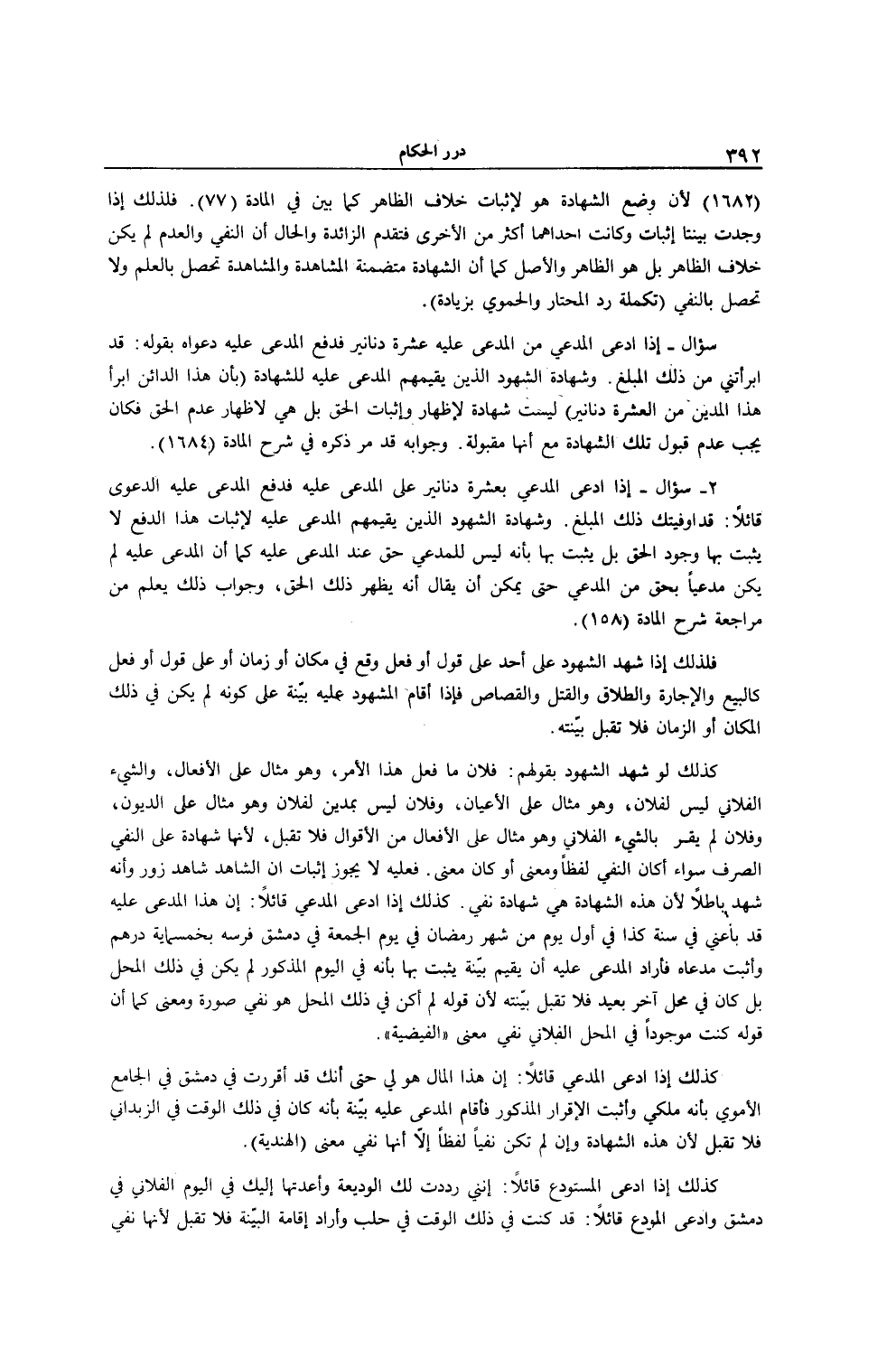 2 - سُؤَالٌ - إذَا ادَّعَى الْمُدَّعِي بِعَشَرَةِ دَنَانِيرَ عَلَى الْمُدَّعَى عَلَيْهِ فَدَفَعَ الْمُدَّعَى عَلَيْهِ الدَّعْوَى قَائِلًا: قَدْ أَوْفَيْتُك ذَلِكَ الْمَبْلَغَ. وَشَهَادَةُ الشُّهُودِ الَّذِينَ يُقِيمُهُمْ الْمُدَّعَى عَلَيْهِ لِإِثْبَاتِ هَذَا الدَّفْعِ لَا يَثْبُتُ بِهَا وُجُودُ الْحَقِّ بَلْ يَثْبُتُ بِهَا بِأَنَّهُ لَيْسَ لِلْمُدَّعِي حَقٌّ عِنْدَ الْمُدَّعَى عَلَيْهِ كَمَا أَنَّ الْمُدَّعَى عَلَيْهِ لَمْ يَكُنْ مُدَّعِيًا بِحَقٍّ مِنْ الْمُدَّعِي حَتَّى يُمْكِنَ أَنْ يُقَالَ: إنَّهُ يَظْهَرُ ذَلِكَ الْحَقُّ وَجَوَابُ ذَلِكَ يُعْلَمُ مِنْ مُرَاجَعَةِ شَرْحِ الْمَادَّةِ (158) .