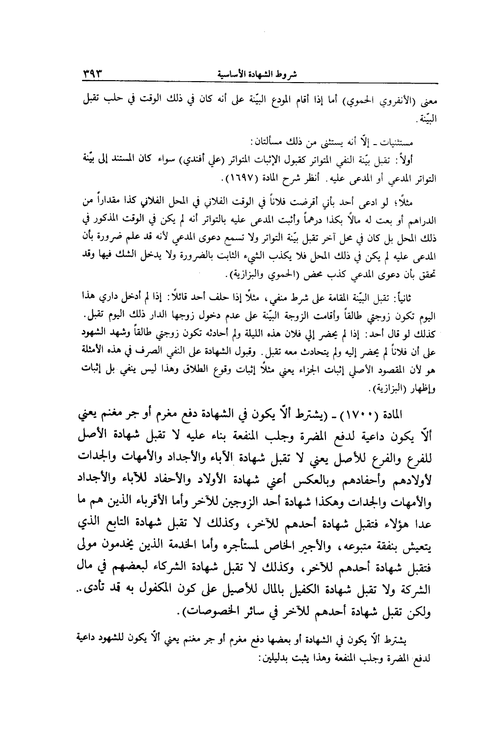 مُسْتَثْنَيَاتٌ - إلَّا أَنَّهُ يُسْتَثْنَى مِنْ ذَلِكَ مَسْأَلَتَانِ: أَوَّلًا: تُقْبَلُ بَيِّنَةُ النَّفْيِ الْمُتَوَاتِرِ كَقَبُولِ الْإِثْبَاتِ الْمُتَوَاتِرِ (عَلِيٌّ أَفَنْدِي) سَوَاءٌ كَانَ الْمُسْتَنِدُ إلَى بَيِّنَةِ التَّوَاتُرِ الْمُدَّعِي أَوْ الْمُدَّعَى عَلَيْهِ اُنْظُرْ شَرْحَ الْمَادَّةِ (1697) .