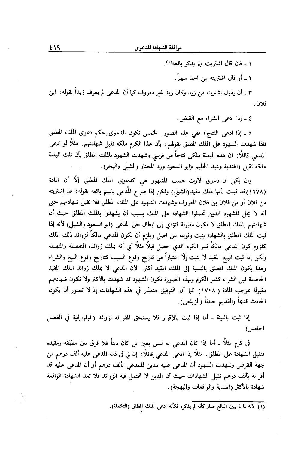 فَفِي هَذِهِ الصُّوَرِ الْخَمْسِ تَكُونُ الدَّعْوَى بِحُكْمِ دَعْوَى الْمِلْكِ الْمُطْلَقِ فَإِذَا شَهِدَتْ الشُّهُودُ عَلَى الْمِلْكِ الْمُطْلَقِ بِقَوْلِهِمْ: بِأَنَّ هَذَا الْكَرْمَ مِلْكُهُ تُقْبَلُ شَهَادَتُهُمْ. مَثَلًا لَوْ ادَّعَى الْمُدَّعِي قَائِلًا: إنَّ هَذِهِ الْبَغْلَةَ مِلْكِي نِتَاجًا مِنْ فَرَسِي وَشَهِدَتْ الشُّهُودُ بِالْمِلْكِ الْمُطْلَقِ بِأَنَّ تِلْكَ الْبَغْلَةَ مِلْكُهُ تُقْبَلُ (الْهِنْدِيَّةُ وَعَبْدُ الْحَلِيمِ وَأَبُو السُّعُودِ وَرَدُّ الْمُحْتَارِ وَالشِّبْلِيُّ وَالْبَحْرُ) .