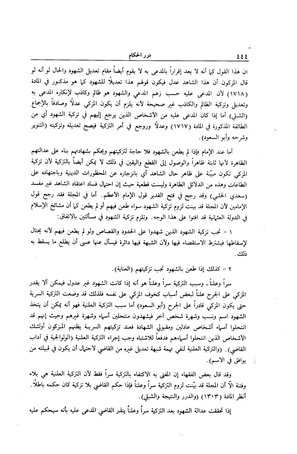 وَقَدْ قَالَ بَعْضُ الْفُقَهَاءِ: إنَّ الْمُفْتَى بِهِ الِاكْتِفَاءُ بِالتَّزْكِيَةِ سِرًّا فَقَطْ؛ لِأَنَّ التَّزْكِيَةَ الْعَلَنِيَّةَ هِيَ بَلَاءٌ وَفِتْنَةٌ إلَّا أَنَّ الْمَجَلَّةَ قَدْ بَيَّنَتْ لُزُومَ التَّزْكِيَةِ سِرًّا وَعَلَنًا فَإِذَا حَكَمَ الْقَاضِي بِلَا تَزْكِيَةٍ كَانَ حُكْمُهُ بَاطِلًا اُنْظُرْ الْمَادَّةَ (1303) (وَالدُّرَرُ وَالنَّتِيجَةُ وَالشِّبْلِيُّ) .
