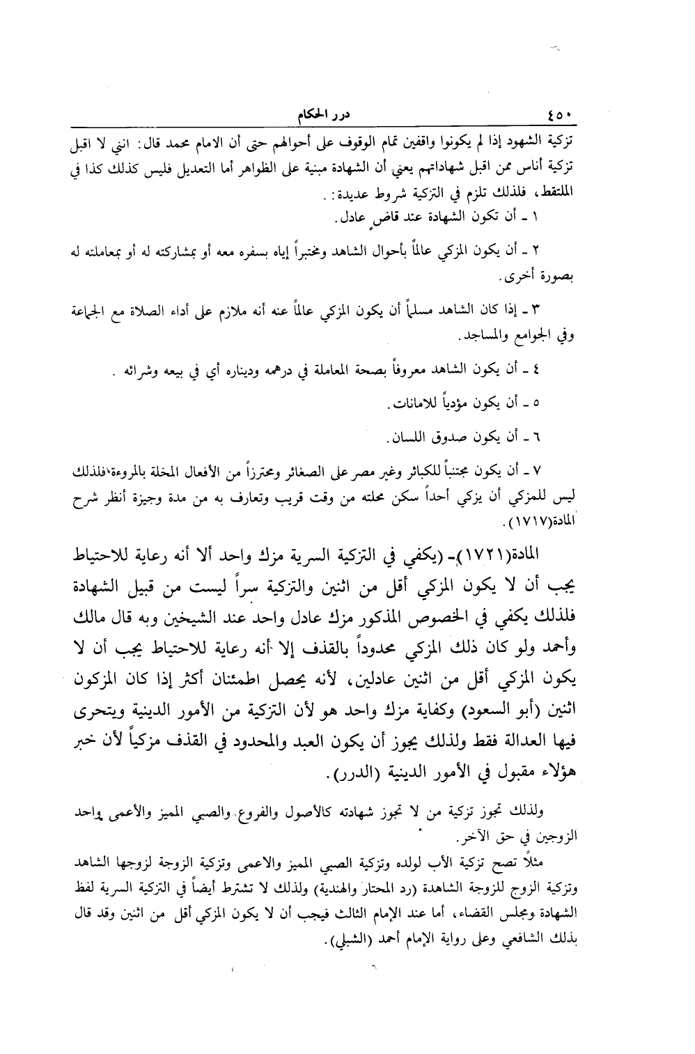[ (الْمَادَّةُ 1721) يَكْفِي فِي التَّزْكِيَةِ السَّرِيَّةِ مُزَكٍّ وَاحِدٍ]