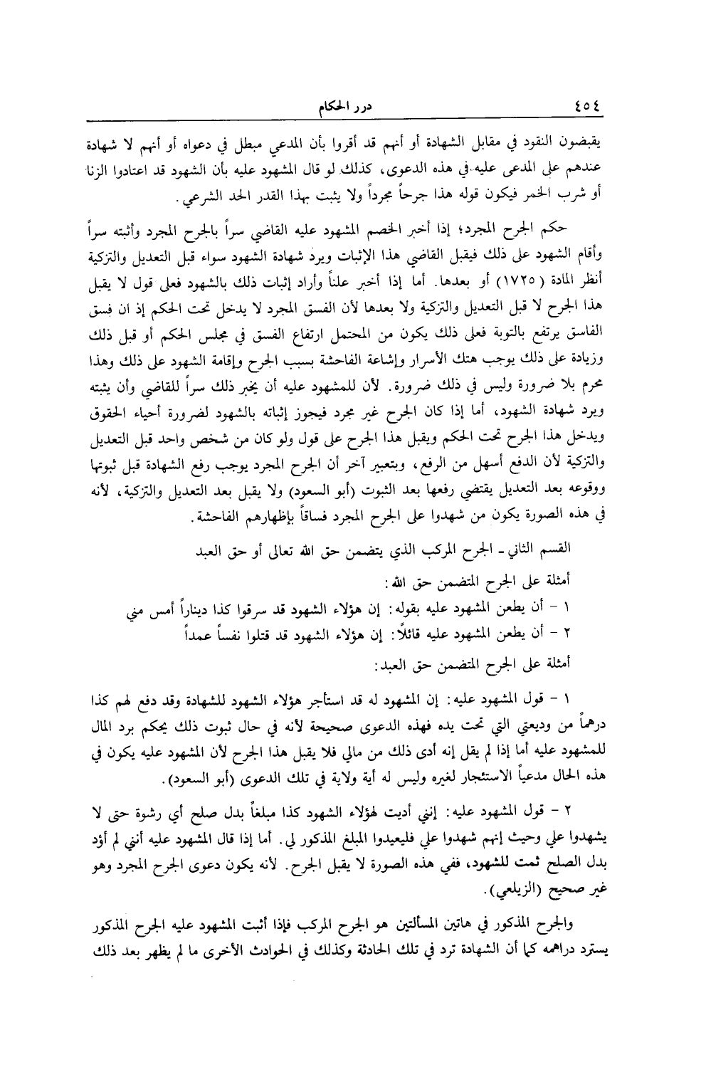 حُكْمُ الْجَرْحِ الْمُجَرَّدِ: إذَا أَخْبَرَ الْخَصْمُ الْمَشْهُودُ عَلَيْهِ الْقَاضِيَ سِرًّا بِالْجَرْحِ الْمُجَرَّدِ وَأَثْبَتَهُ سِرًّا وَأَقَامَ الشُّهُودُ عَلَى ذَلِكَ فَيَقْبَلُ الْقَاضِي هَذَا الْإِثْبَاتَ وَيَرُدُّ شَهَادَةَ الشُّهُودِ سَوَاءٌ قَبْلَ التَّعْدِيلِ وَالتَّزْكِيَةِ اُنْظُرْ الْمَادَّةَ (1725) أَوْ بَعْدَهَا. أَمَّا إذَا أَخْبَرَ عَلَنًا وَأَرَادَ إثْبَاتَ ذَلِكَ بِالشُّهُودِ فَعَلَى قَوْلٍ لَا يُقْبَلُ هَذَا الْجَرْحُ لَا قَبْلَ التَّعْدِيلِ وَالتَّزْكِيَةِ وَلَا بَعْدَهَا؛ لِأَنَّ الْفِسْقَ الْمُجَرَّدَ لَا يَدْخُلُ تَحْتَ الْحُكْمِ إذْ أَنَّ فِسْقَ الْفَاسِقِ يَرْتَفِعُ بِالتَّوْبَةِ، فَعَلَى ذَلِكَ يَكُونُ مِنْ الْمُحْتَمَلِ ارْتِفَاعُ الْفِسْقِ فِي مَجْلِسِ الْحُكْمِ أَوْ قَبْلَ ذَلِكَ وَزِيَادَةً عَلَى ذَلِكَ يُوجِبُ هَتْكَ الْأَسْرَارِ وَإِشَاعَةَ الْفَاحِشَةِ بِسَبَبِ الْجَرْحِ وَإِقَامَةِ الشُّهُودِ عَلَى ذَلِكَ وَهَذَا مُحَرَّمٌ بِلَا ضَرُورَةٍ وَلَيْسَ فِي ذَلِكَ ضَرُورَةٌ؛ لِأَنَّ لِلْمَشْهُودِ عَلَيْهِ أَنْ يُخْبِرَ ذَلِكَ سِرًّا لِلْقَاضِي وَأَنْ يُثْبِتَهُ وَيَرُدَّ شَهَادَةَ الشُّهُودِ، أَمَّا إذَا كَانَ الْجَرْحُ غَيْرَ مُجَرَّدٍ فَيَجُوزُ إثْبَاتُهُ بِالشُّهُودِ لِضَرُورَةِ إحْيَاءِ الْحُقُوقِ وَيَدْخُلُ هَذَا الْجَرْحُ تَحْتَ الْحُكْمِ وَيُقْبَلُ هَذَا الْجَرْحُ عَلَى قَوْلٍ وَلَوْ كَانَ مِنْ شَخْصٍ وَاحِدٍ قَبْلَ التَّعْدِيلِ وَالتَّزْكِيَةِ؛ لِأَنَّ الدَّفْعَ أَسْهَلُ مِنْ الرَّفْعِ، وَبِتَعْبِيرٍ آخَرَ إنَّ الْجَرْحَ الْمُجَرَّدَ يُوجِبُ رَفْعَ الشَّهَادَةِ قَبْلَ ثُبُوتِهَا، وَوُقُوعُهُ بَعْدَ التَّعْدِيلِ يَقْتَضِي رَفْعَهَا بَعْدَ الثُّبُوتِ (أَبُو السُّعُودِ) وَلَا يُقْبَلُ بَعْدَ التَّعْدِيلِ وَالتَّزْكِيَةِ؛ لِأَنَّهُ فِي هَذِهِ الصُّورَةِ يَكُونُ مَنْ شَهِدُوا عَلَى الْجَرْحِ الْمُجَرَّدِ فُسَّاقًا بِإِظْهَارِهِمْ الْفَاحِشَةَ.