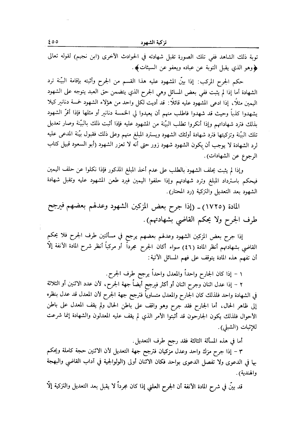 إذَا جَرَّحَ بَعْضُ الْمُزَكِّينَ الشُّهُودَ وَعَدَلَهُمْ بَعْضُهُمْ يُرَجَّحُ فِي مَسْأَلَتَيْنِ طَرَفُ الْجَرْحِ فَلَا يَحْكُمُ الْقَاضِي بِشَهَادَتِهِمْ اُنْظُرْ الْمَادَّةَ (46) سَوَاءٌ أَكَانَ الْجَرْحُ مُجَرَّدًا أَوْ مُرَكَّبًا اُنْظُرْ شَرْحَ الْمَادَّةِ الْآنِفَةِ، إلَّا أَنَّ تَفَهُّمَ هَذِهِ الْمَادَّةِ يَتَوَقَّفُ عَلَى فَهْمِ الْمَسَائِلِ الْآتِيَةِ: